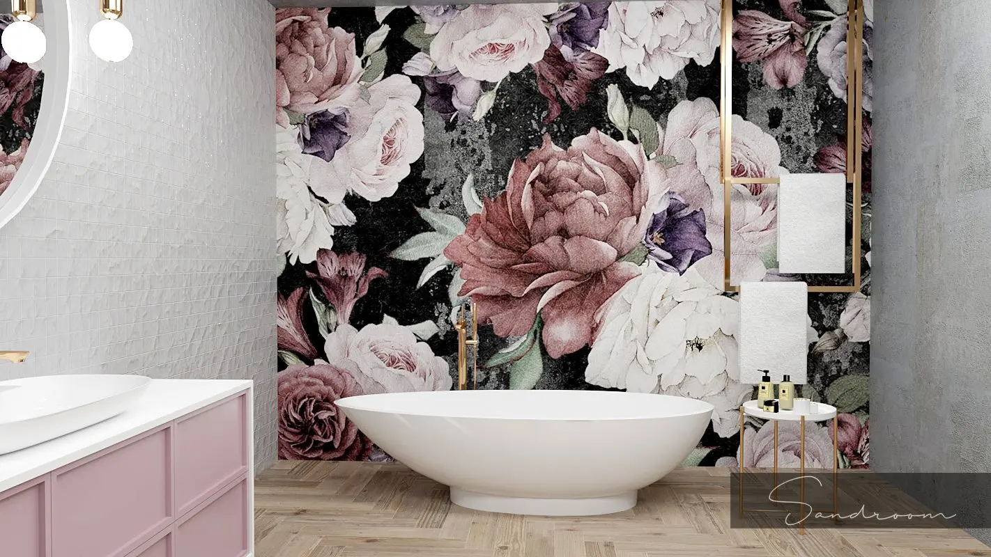 Tak jak pisaliśmy wcześniej styl glamour odszedł od intensywnych fioletów. Ich miejsce zajęły tapety z dużymi motywami kwiatowymi.
