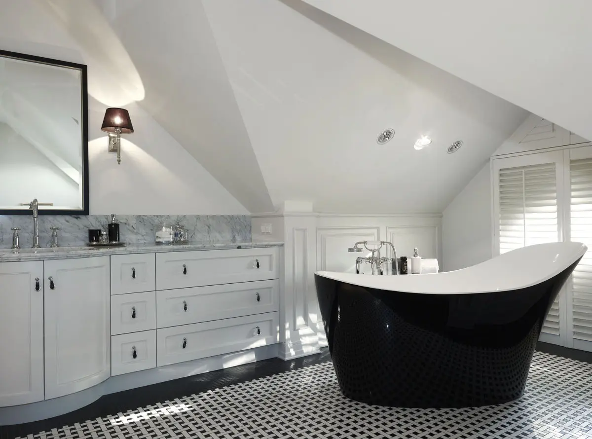 Urządzając łazienkę w stylu glamour warto wziąć pod uwagę połyskujące płytki utrzymane w kolorach czerni, bieli i kremu czy jasnego beżu. Warto postawić na szkliwiony gres polerowany na wysoki połysk, a sprawdzi się on zarówno na podłodze, jak i ścianie.