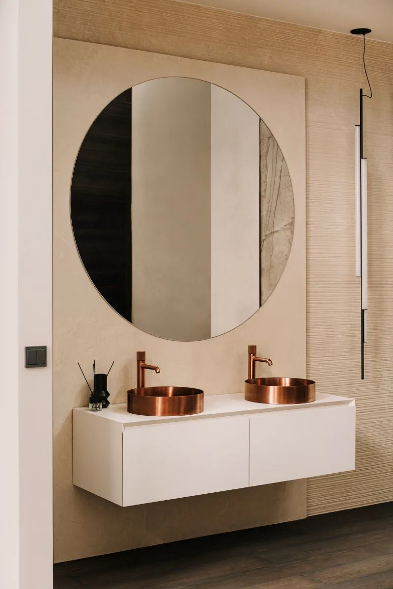 Lustro powinno być umieszczone około 20 cm nad umywalką, ponad linią baterii. Tafle zaczynające się na równi z blatem lub umywalką są wyjątkową ozdobą łazienki, ale bardzo trudne w utrzymaniu w czystości. Głowa patrzącej w lustro osoby powinna znajdować się centralnie, w połowie wysokości tafli. Dlatego tak ważne jest uwzględnienie wzrostu wszystkich domowników, i tych najniższych, i tych najwyższych.