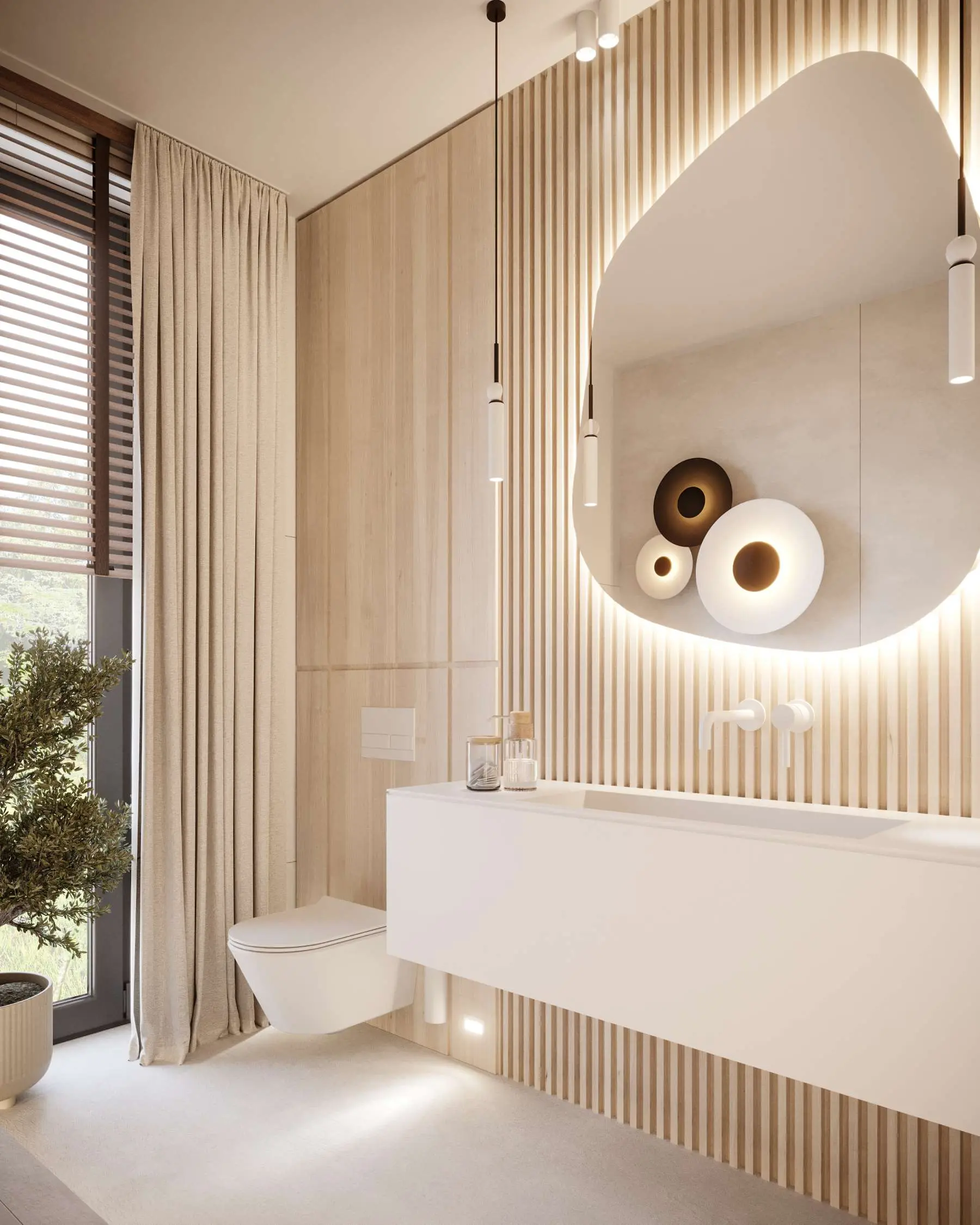 Na ścianie z drewnianych lameli zawisło duże nieregularne lustro a pod nim znajduje się umywalka z blatem. Ten wybór jest idealny, gdyż nie musimy martwić się z jakiego materiału wykonać blat i czy będzie nam długo służył. Umywalka z blatem, dzięki zastosowaniu zintegrowanej płaszczyzny, to same zalety. Scalenie tych elementów oznacza także praktyczność wynikającą z łatwości usuwania nieczystości. Z uwagi na brak szczelin i zakamarków łączących te dwa elementy, nie ma mowy o siedliskach brudu i bakterii czy mozolnym szorowaniu. By wyeliminować zabrudzenia, wystarczy zetrzeć pozostałości wody czy kurz do odpływu i wszystko przetrzeć miękką szmatką. Idealnie w tę kompozycję łazienki wpisuje się biała armatura Hushlab Siena White.