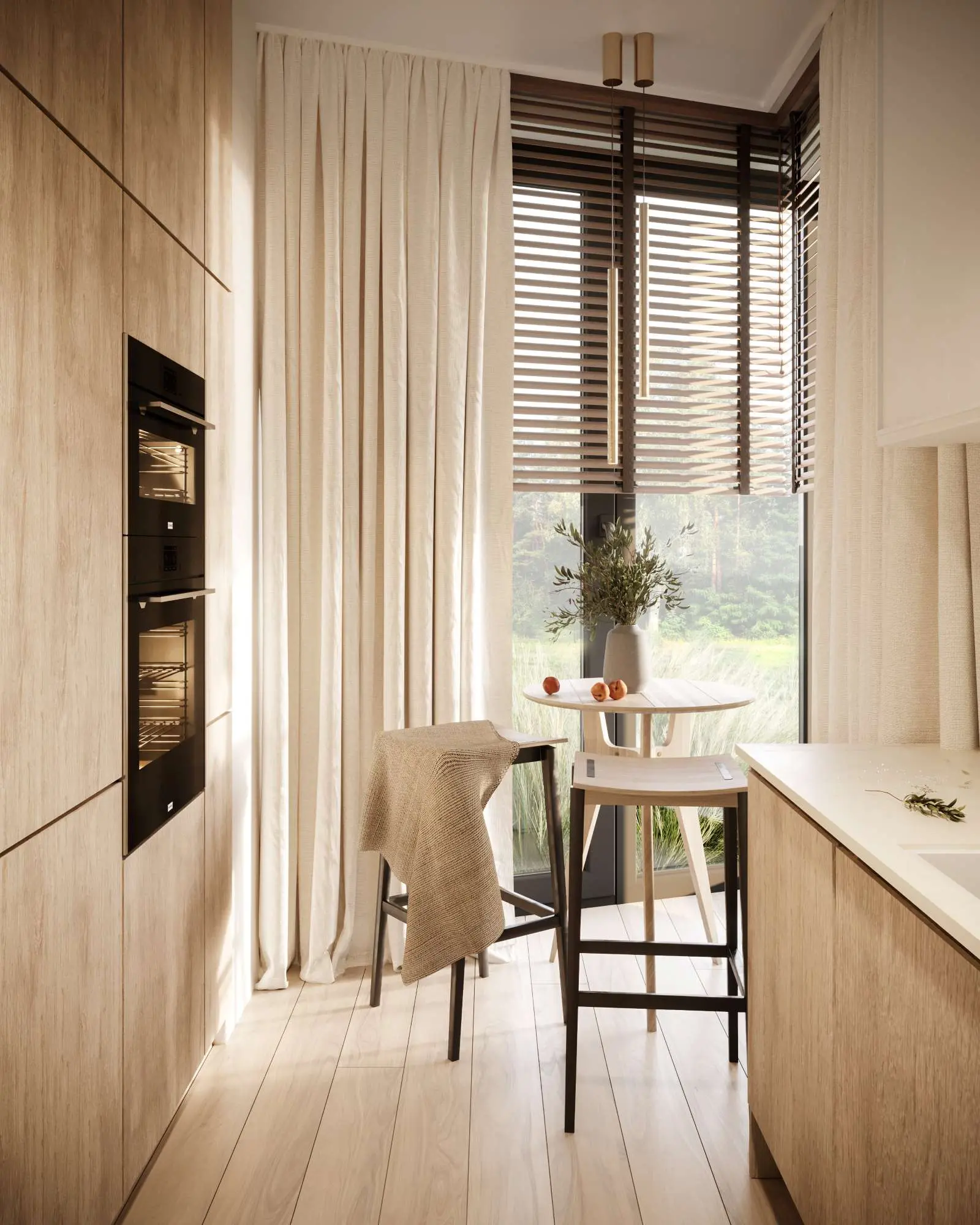 W kuchni wygospodarowano również mały kącik, w którym można się ukryć w zaciszu domowym z pierwszą poranną kawą. Ciekawy design prezentują wybrane hokery Ton Stockholm oraz zwieszana złota lampa w kształcie cienkiej rurki marki Leds 4 Stylus Pendant.