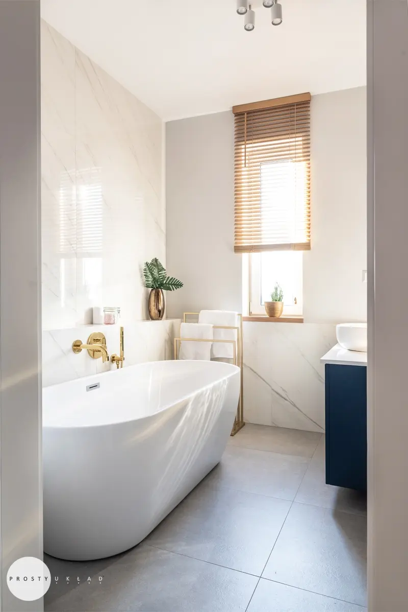 Pomimo mocnego akcentu w postaci granatowej szafki łazienka jest niezwykle delikatna i miła w odbiorze. Wspaniale wpisuje się w trendy Biophilic Design. Ciepła dodają drewniane dodatki, jak żaluzje oraz lustro w drewnianej ramie. Blasku dodają złote baterię i dodatki.