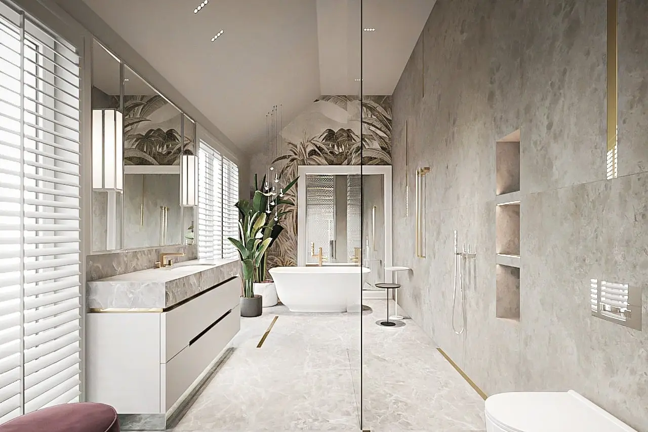 Spektakularne projekty dwóch łazienek, eleganckie i wytworne, gdzie ciekawą kompozycję podkreślają użyte w nich tapety nawiązujące do natury. W projektach wykorzystane zostały produkty wysokiej jakości a surowość szarego marmuru przełamana kolorowymi akcentami oraz złotą armaturą.