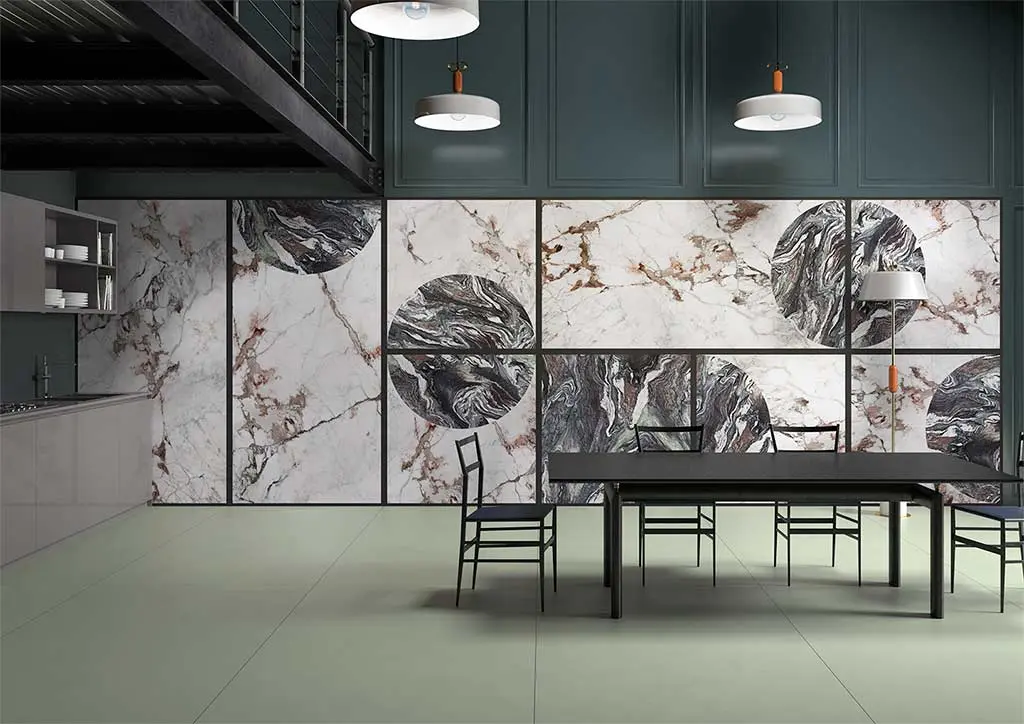 Dzięki zaawansowanej technologii można osiągnąć niezwykły efekt, szczególnie w przypadku płytek porcelanowych wielkoformatowcyh od 60 x 120 do 120 x 260 cm. Dekoracja cyfrowa płyt porcelanowych pozwala na powstanie powierzchni inspirowanej szeregiem materiałów, od naturalnych, takich jak marmur i drewno, po przemysłowe, takie jak metale i cement.