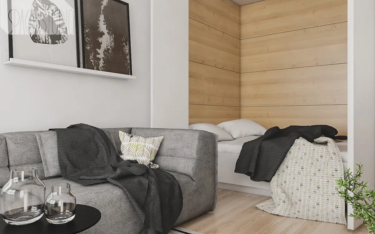 W ultra małych pomieszczeniach, gdzie chcemy uniknąć zagracenia, warto pomyśleć nad kompaktowymi systemami. Autorem jednego z najbardziej popularnych pomysłów pośród polskich architektów jest projekt pracowni Spacja Studio. Pożądaną minimalistyczną estetykę uzyskano wprowadzając do wnętrza system „szaf”, w których mieści się nie tylko łóżko, ale i też biurko i toaletka w jednym. Zgodzicie się ze mną, że nie jeden raz i nie dwa, skorzystalibyście z opcji zamknięcia bałaganu panującego na łóżku, albo biurku?:)