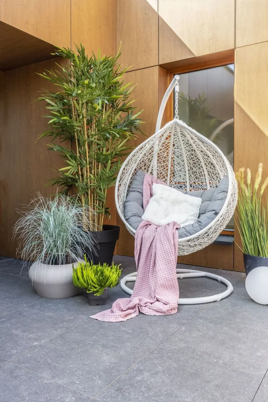 Kolejna propozycja to aranżacja tarasów na nowoczesnym Osiedlu Holm House. W tym przypadku zdecydowano się na projekt, który przypomina przytulny, outdoorowy salon. Sercem tej przestrzeni są komfortowe meble wypoczynkowe wraz ze stolikiem kawowym. Również tu wprowadzono dekoracyjną zieleń w postaci roślin doniczkowych oraz ozdobnych traw. Całość uzupełniają huśtawka oraz kuliste lampy. Jak podkreśla Olga Nowosad-Szewców, architekt wnętrz odpowiedzialna za projekt: ,,Całość osadzona jest w miejskim, nowoczesnym stylu, gdzie króluje minimalistyczna, duża sofa otoczona miękkimi poduszkami dla zwiększenia komfortu wypoczynku. Modne dodatki, przenikanie się roślinności, poprzez wprowadzenie jej kontynuacji na powierzchnię tarasu sprawiają, że czujemy wakacyjny klimat we własnym domu.”