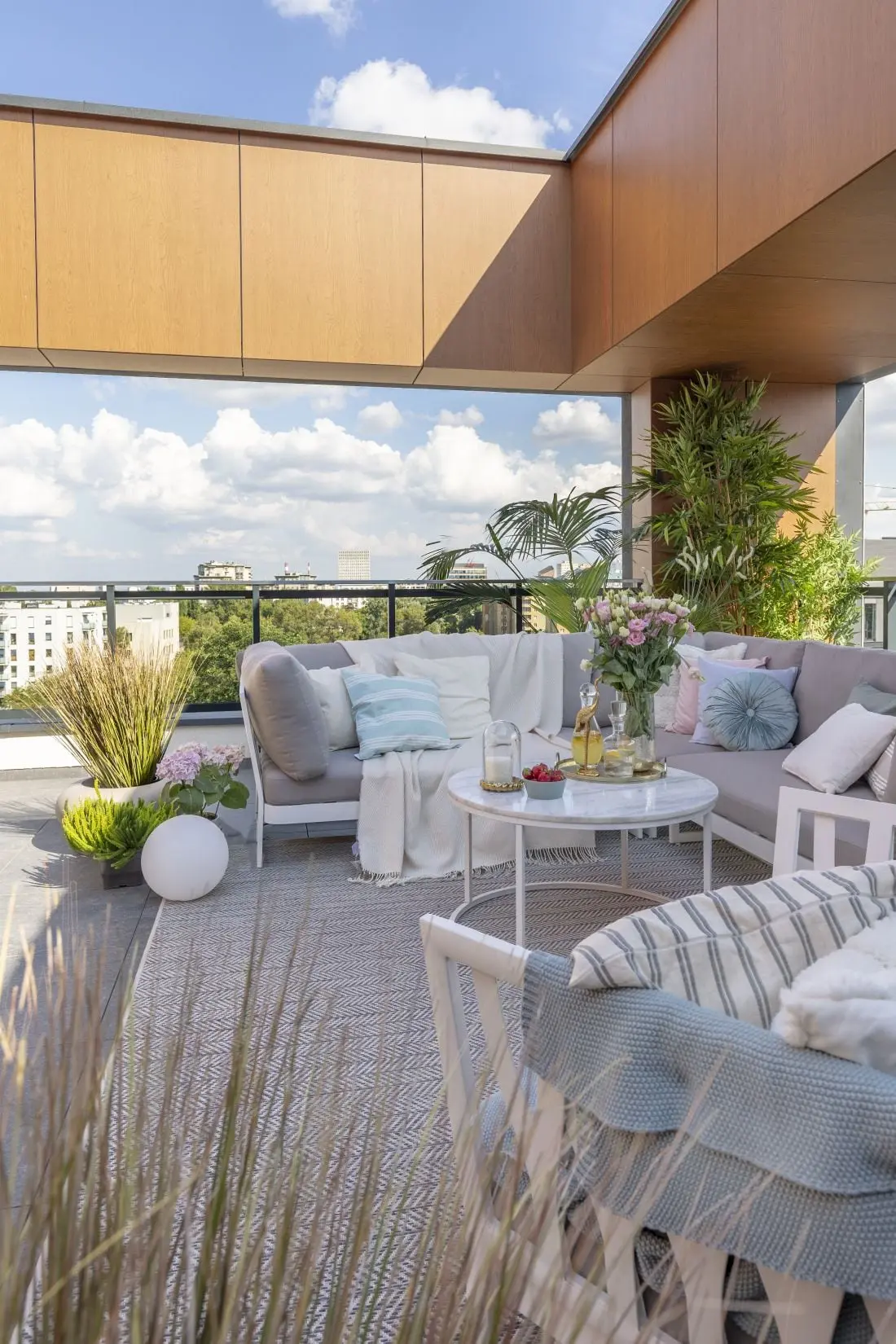 Umiejętne i funkcjonalne zagospodarowanie tarasu często bywa nie lada wyzwaniem. Ważne jest tu nie tylko maksymalne wykorzystanie dostępnej przestrzeni, ale także dbałość o detale i wprowadzenie atmosfery, która pozwala na relaks i pozytywnie nastraja. Właśnie takie są tarasy zaaranżowane przez Olgę Nowosad-Szewców, architekt wnętrz Decoroom, która jak podkreśla: ,,Tarasy miały przede wszystkim być zaaranżowane tak, żeby stanowiły kontynuację mieszkania i jego stylu. W okresie wiosenno-letnim taras staje się kolejnym tzw. pokojem bez sufitu, w którym możemy miło spędzić czas.”