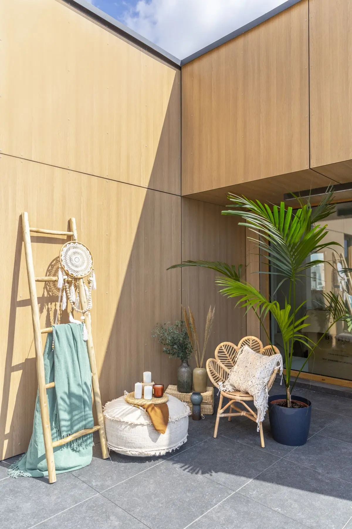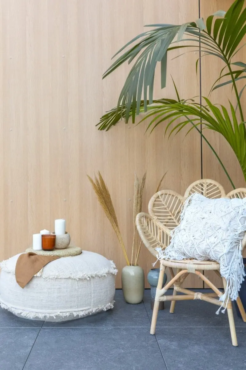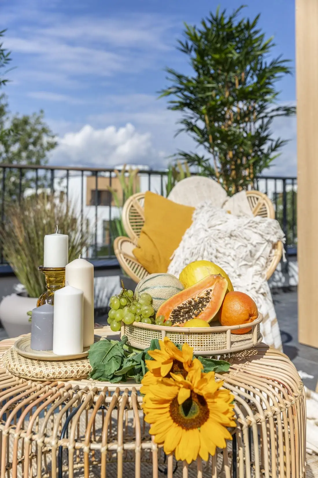 Na Osiedlu Mickiewicza w Warszawie pracownia zdecydowała się na aranżację tarasów w stylu boho. Dzięki temu przestrzeń zyskała swobodny charakter, sprzyjający relaksacji. ,,Styl boho to kompozycja maksymalnie blisko natury, osadzona w aktualnych trendach. Wszystko przypomina o otaczającym nas krajobrazie – kształty, kolory i faktury” – dodaje Olga Nowosad-Szewców, architekt wnętrz Decoroom. Na tarasie stanęły wiklinowe fotele z oparciami o fantazyjnym kształcie i stolik kawowy z tego samego materiału. Wakacyjny klimat wprowadzają tu łapacz snów, kolorowe pledy, poduszki i rośliny w donicach. Całość aranżacji dopełniają detale: wygodna pufa, dekoracyjna drabina oraz mata w delikatnym, beżowym odcieniu.