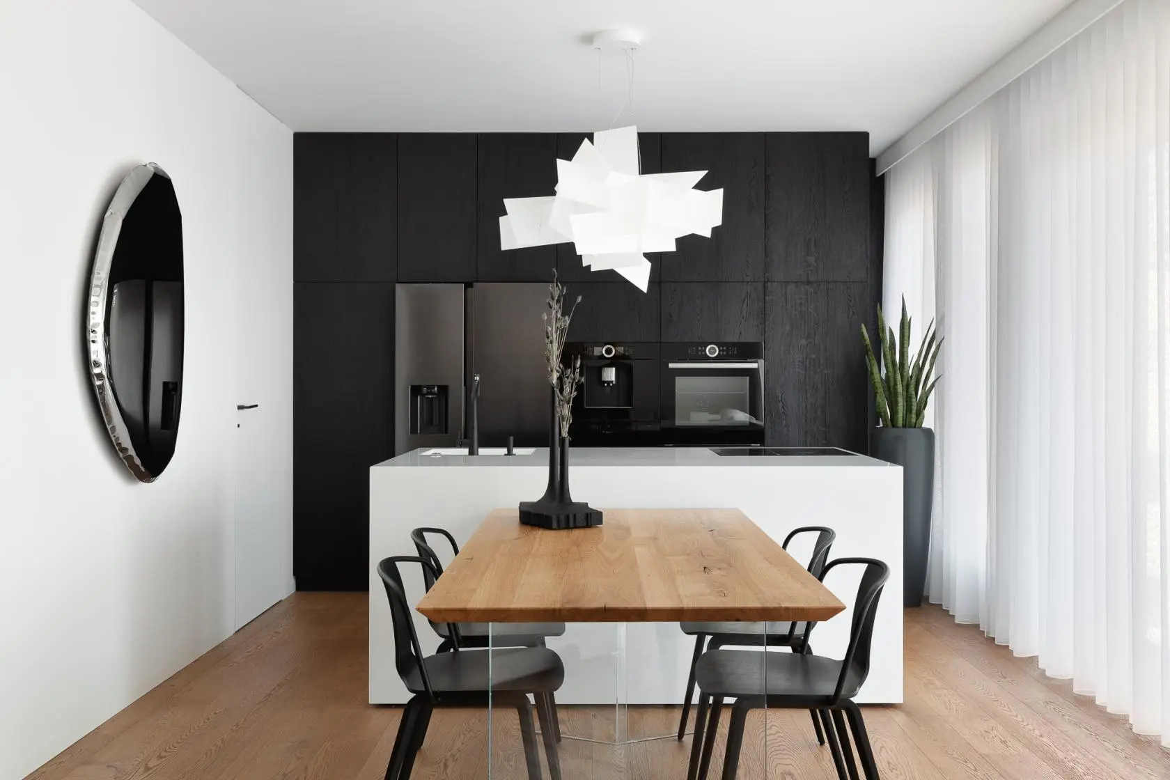 Ciemne, nastrojowe i eleganckie barwy stanowią punkt wyjścia dla aranżacji w stylu Dark Nordic. Czerń jest jednym z kolorów najczęściej utożsamianym z tą estetyką, jednak nie jedynym. Równie często pożądany klimat wnętrz, uzyskuje się dzięki zastosowaniu szlachetnych odcieni ciemnych zieleni: leśnej, zgaszonej szałwii czy głębokiej zieleni z dodatkiem czerni. Kolejnym intrygującym kolorem, który pomoże zbudować aranżację w stylu Dark Nordic jest bordo. Głęboki i szlachetny odcień czerwonego wina idealnie komponuje się ze skandynawską estetyką i jest dobrym tłem dla wyselekcjonowanego designu. Dobrym wyborem jest też ciemny granat.