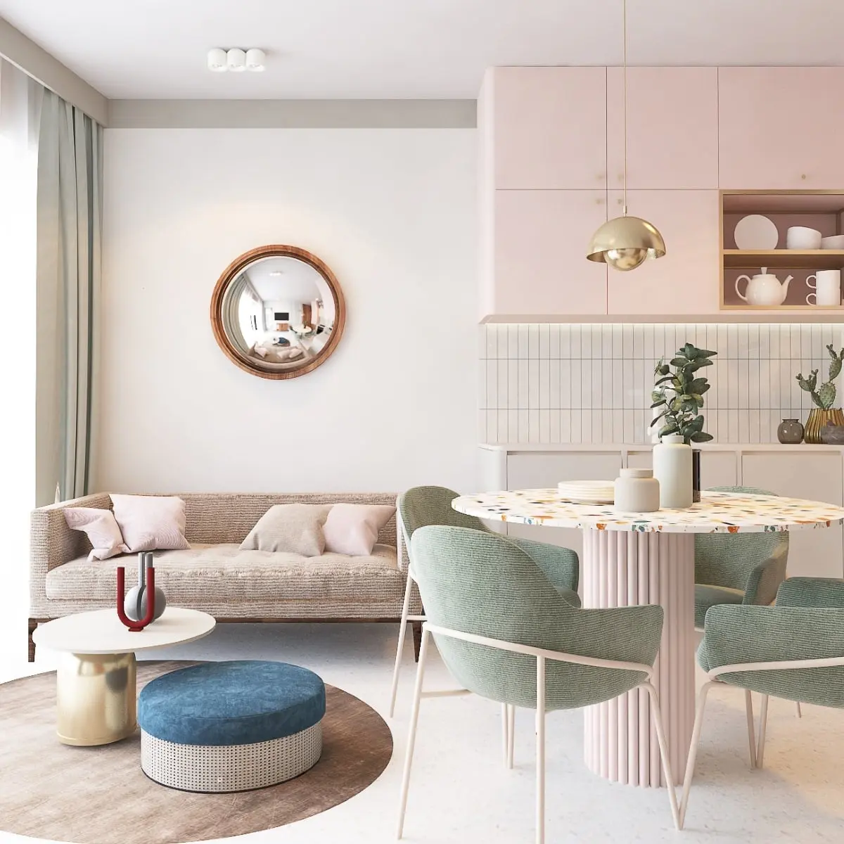Barbiecore uwielbia łączyć wszystkie odcienie różu, a we wnętrzach mile widziana jest zabawa spektrum różowego. Obok jasnych, pudrowych pasteli, zobaczymy mocne i zdecydowane fuksje, a nawet malinowe akcenty, Towarzyszą im kontrastowe detale w turkusie, kanarkowej żółci czy fiolecie.