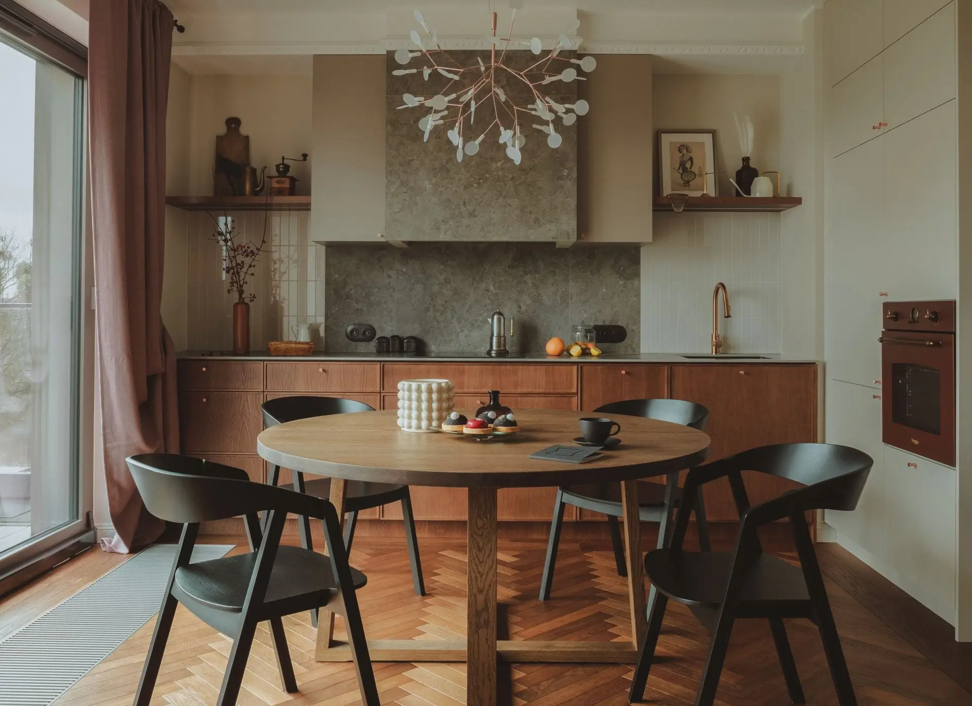 Poza ciemną kolorystyką, we wnętrzach w stylu Dark Nordic, znajdziemy fakturalne dzianiny, welur oraz buklę, dzięki którym można tworzyć warstwy, zapraszające, by się w nich skryć. Dark Nordic szczególnie odnalazł się w wysokich kamienicznych wnętrzach, wśród sztukaterii, gdzie pomalowane na ciemno ściany, nadają przestronnym pomieszczeniom przytulności. Nastrojowa kolorystyka jest idealnym tłem dla mebli vintage, jednocześnie współtworząc ciepłe oraz zachęcające wnętrza.