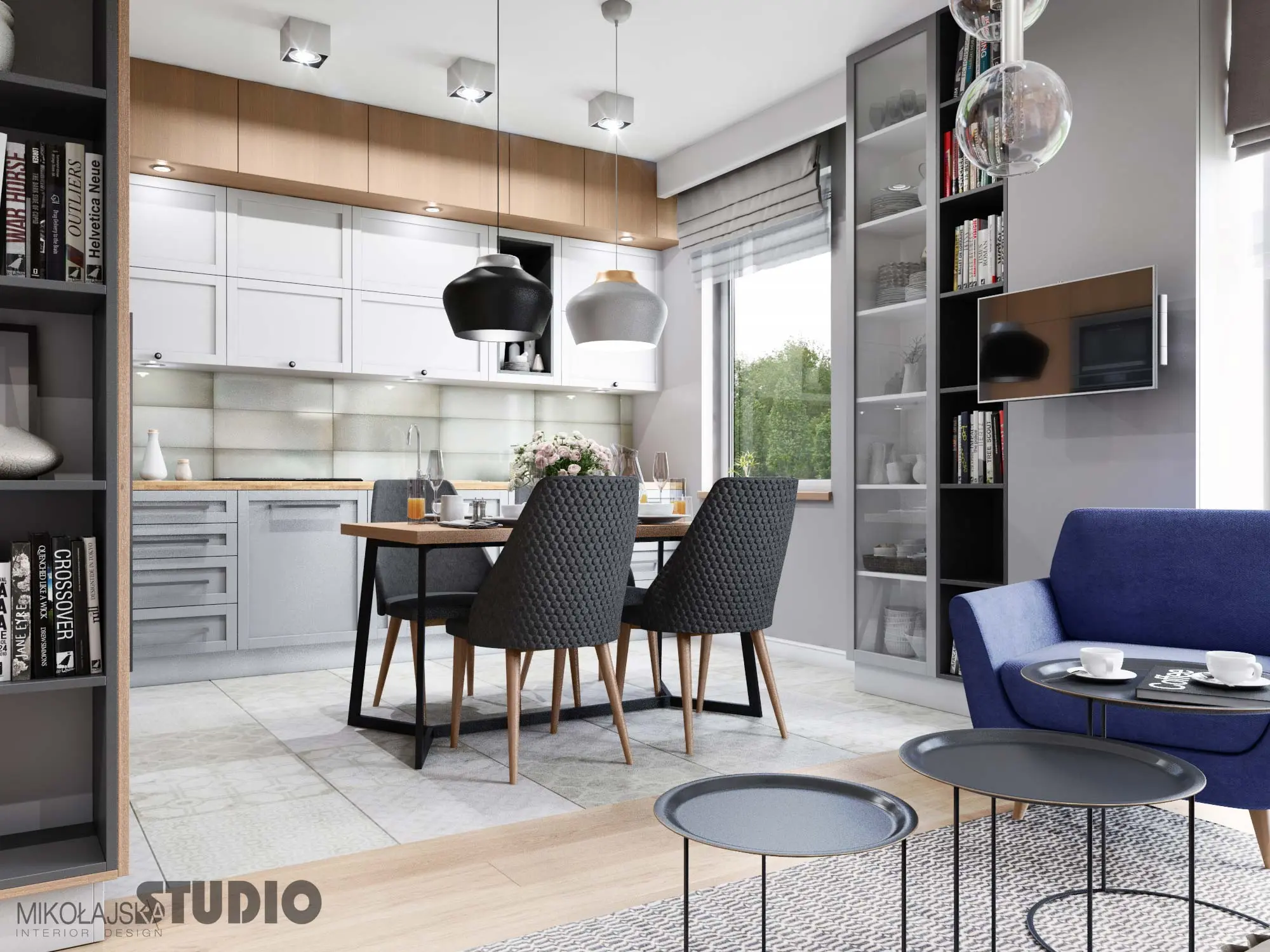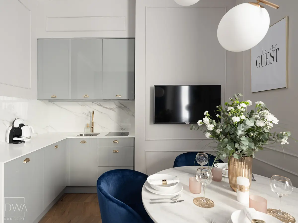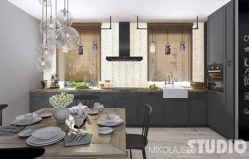 Kuchnia z szarymi górnymi szafkami pięknie skomponowana z płytkami heksagonalnymi nad blatem.