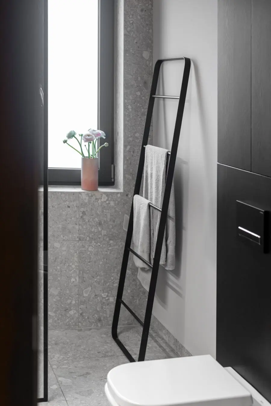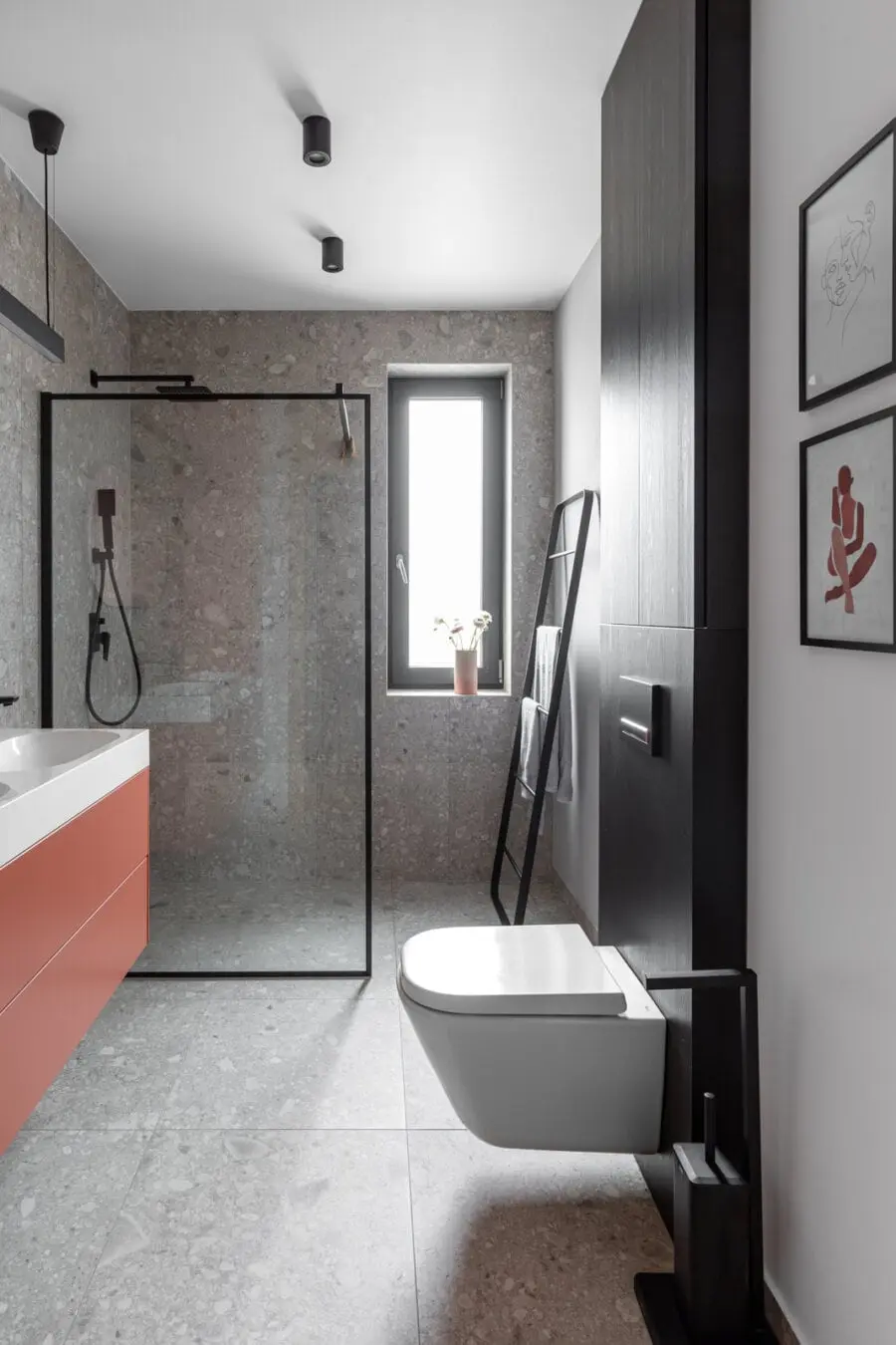 Jeśli szary jest zbyt chłodny w wersji monochromatycznej nie pozostaje nic innego jak połączyć go z drewnem by zrównoważyć wnętrze jego ciepłem i naturalnością. Szare lastryko i czarne dodatki równa się łazienka w pięknym stylu. Element drewniany w postaci szafki pod umywalką ocieplają wnętrze.
