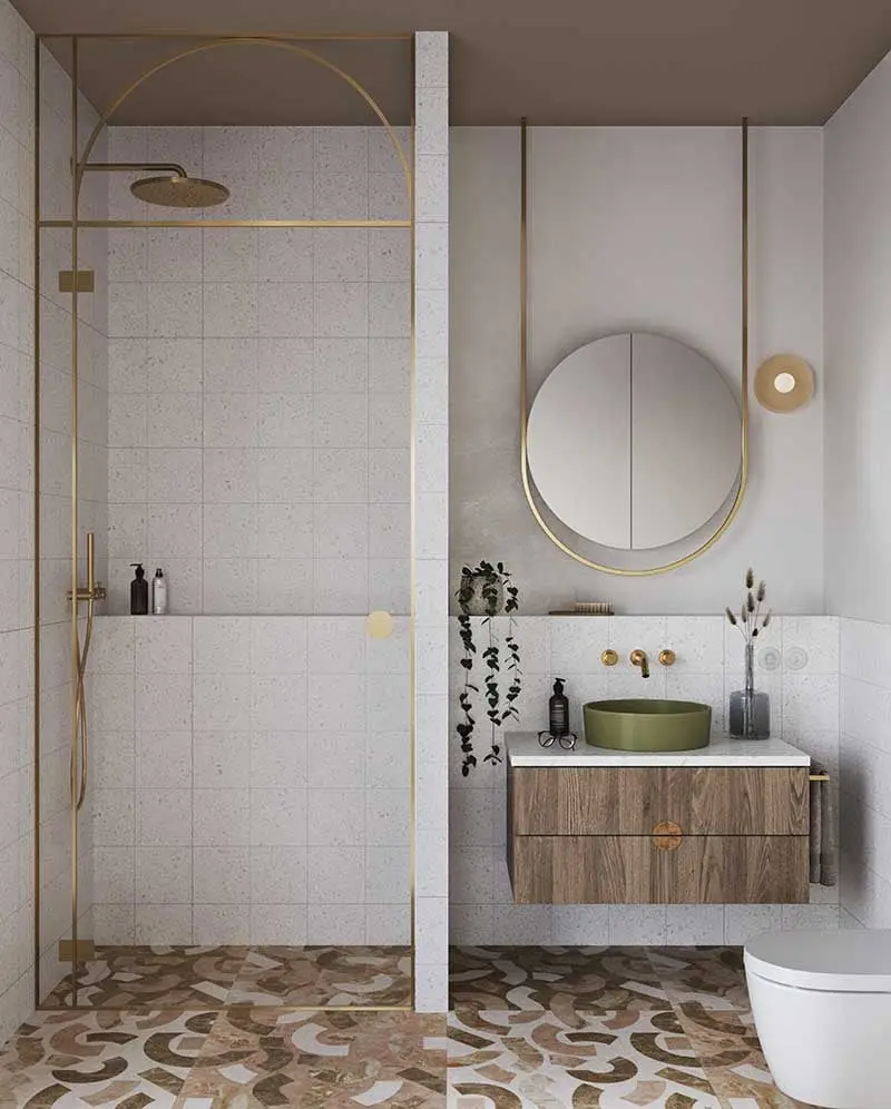 Może nam się wydawać, iż to zestawienie jest zbyt oczywiste. Dlatego warto pobawić się różnymi fakturami płytek. Kupując armaturę w kolorze złota, zwróć uwagę na sposób i jakość wykończenia powierzchni. Unikaj produktów z najniższej półki cenowej – mogą szybko ulec zniszczeniu i zepsuć wystrój „plastikowym” wyglądem.