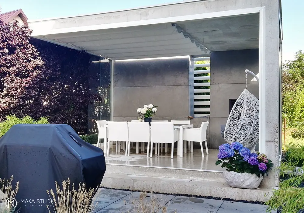 Za projektem tej altany ogrodowej stoi biuro projektowe MAKA.STUDIO. Motywem przewodnim realizacji jest modny beton architektoniczny oraz przeszklenia, które nadają lekkości całej aranżacji. Praktyczności dodaje możliwość zmiany ułożenia ścian systemowych oraz zwijana roleta znajdująca się na „suficie” konstrukcji. Cała altana ma 35 m2, czyli mniej więcej tyle, co niejedna kawalerka. Marzenie, prawda?