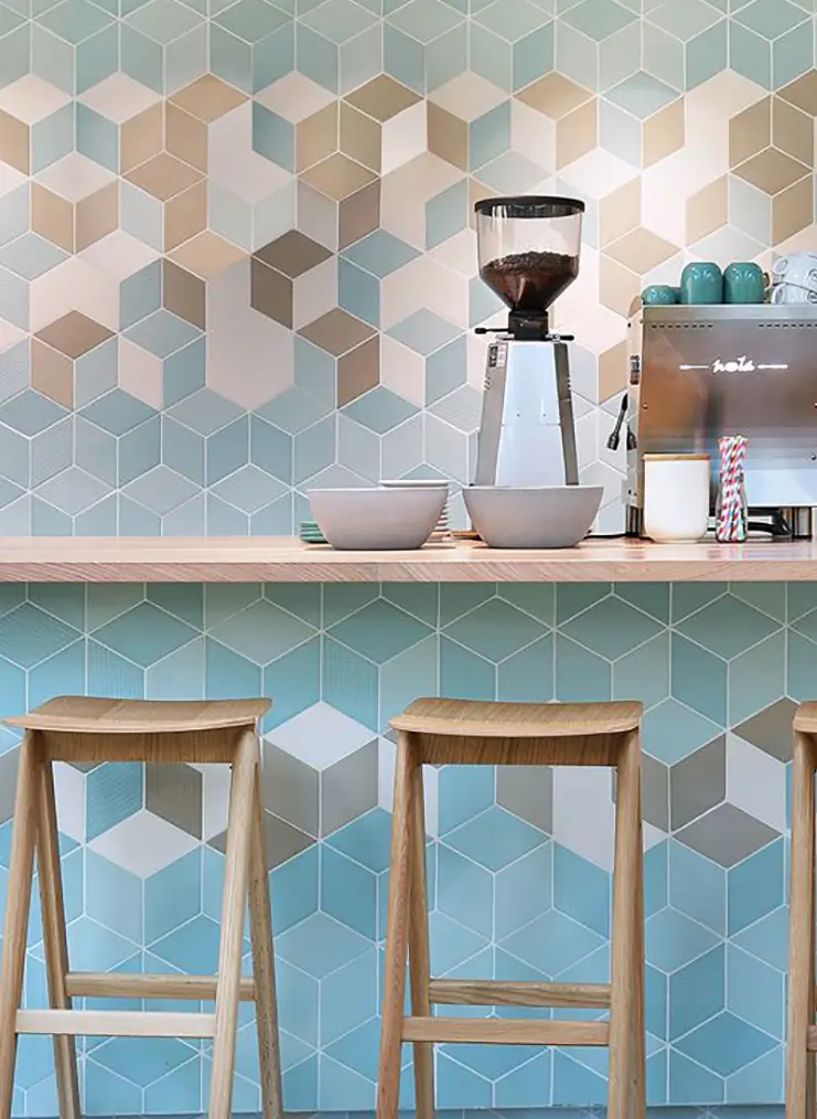 Ciekawą propozycją dla odważnych, lubiących ciekawe wzory, tekstury oraz kolory jest propozycja od Mutina z kolekcją Tex. Szarości, żółcie oraz niebieskości pięknie komponują się z naturalnym drewnianymi blatami w kuchni. Płytki można dowolnie dobierać kolorystycznie tworzyć własne, kreatywne kompozycje.
