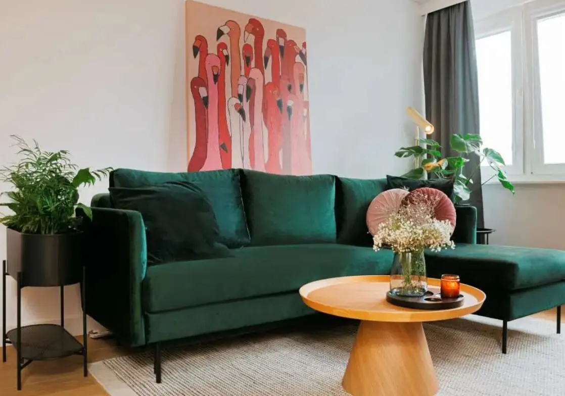 Kolor zielony jest nadal jednym z kolorów, który chętnie przemycamy w aranżacjach naszych mieszkań. Daje on nam poczucie harmonii, spokoju. Jako barwa kojarzy się z naturą więc daje nam relaksujący klimat. Otaczając się nim czujemy się bezpieczni, sam budzi zaufanie. Daj nam też wrażenie świeżości i przestrzeni.