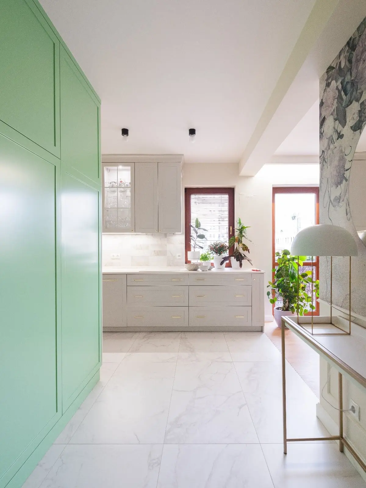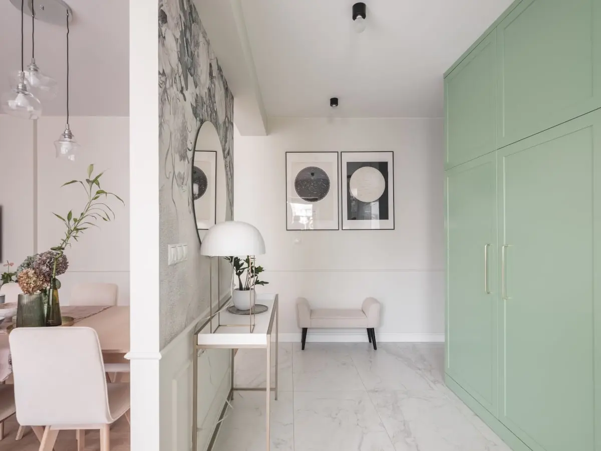 Głównym założeniem projektu było stworzenie przestrzeni funkcjonalnej, przytulnej i jednocześnie przestronnej. Według wytycznych inwestorów, mieszkanie miało być nowoczesne z elementami stylu modern classic. Pierwszym krokiem w stworzeniu wnętrza na miarę potrzeb jego właścicieli, była ingerencja w pierwotny układ. Wyburzono część ścian, tak aby wejście do kuchni było możliwe z holu, a nie tylko z pokoju dziennego, jak było wcześniej. Natomiast linię graniczną pomiędzy salonem i kuchnią, wymusił oryginalny parkiet, który właściciele chcieli zachować. Dzięki zmianom w rozkładzie, udało się stworzyć bardzo reprezentacyjną strefę wejścia, z której można przejść zarówno do salonu, jak i do kuchni. Od samego progu wita piękna zieleń w miętowym odcieniu, która pojawia się pod postacią zabudowy meblowej. Koresponduje z nią tapeta o roślinnym wzorze, umieszczona na przeciwległej ściance, oddzielającej hol od części dziennej. Podłogę pokrywają płytki Marazzi z kolekcji Marble Look. Tekstury o efekcie marmuru z delikatną szarą żyłką, idealnie nawiązują do stylu modern classic.