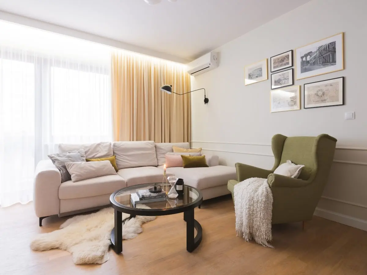 Właściciele mieszkania chcieli, by aranżacja wnętrza uwzględniła posiadane przez nich elementy wyposażenia. Jednym z nich był fotel w oliwkowej tkaninie. Mebel ten stał się inspiracją dla kolorystyki zastosowanej w części dziennej. Projektantka zaproponowała jasne tło, uzupełnione o akcenty barwne. Białe ściany zdobią subtelne listwy sztukateryjne, nawiązujące do stylu kamienicznego. Pojawiły się tu też grafiki z kolekcji inwestorów. Wspomniany uszak został dodatkowo wyeksponowany, dzięki zestawieniu go z jasną sofą. Motyw oliwki pojawił się jeszcze pod postacią poduch dekoracyjnych. Oryginalny drewniany parkiet nadał przestrzeni przytulności.