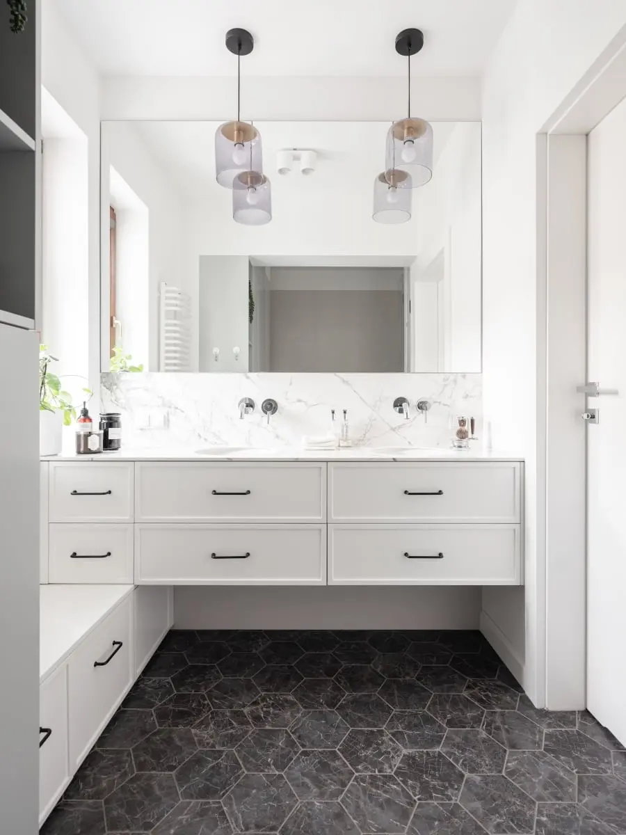 Główną łazienkę zaaranżowano w klasycznym zestawie bieli i czerni. Podłogę pokrywają heksagonalne płytki o teksturze czarnego marmuru, pochodzące z kolekcji Marazzi. W strefie umywalki zastosowano spieki kwarcowe. Wielkoformatowe płyty znalazły się na ścianie oraz na blacie. Wyrafinowana elegancja salonu kąpielowego, została podkreślona chromowaną armaturą marki Steinberg, a także ciekawymi lampami wiszącymi.