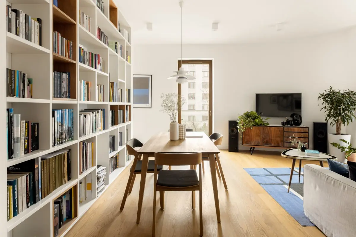 Designerska strefa jadalniana z biblioteką w tle