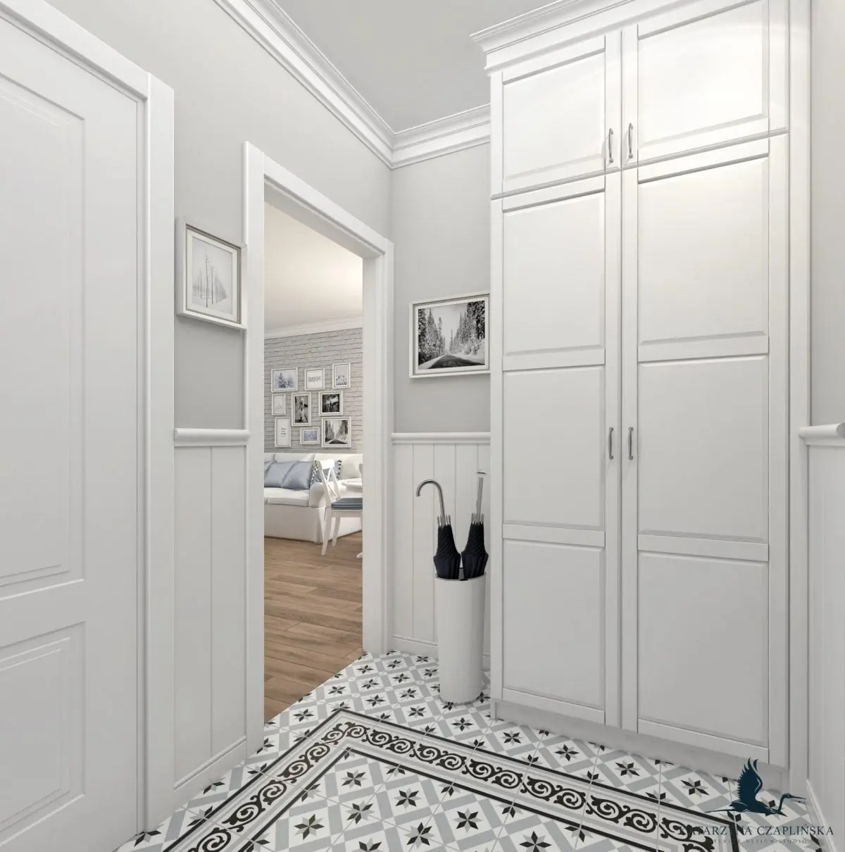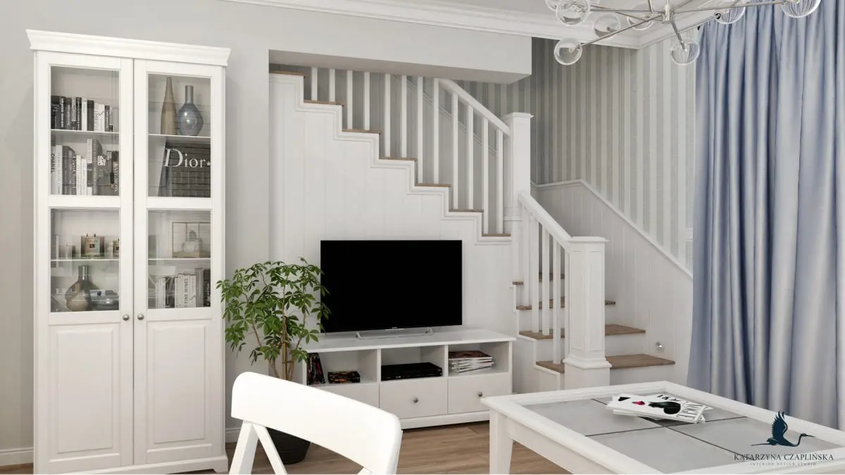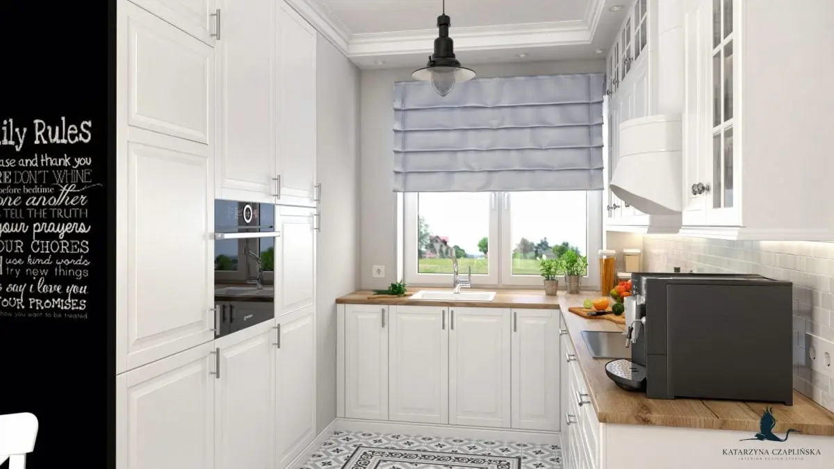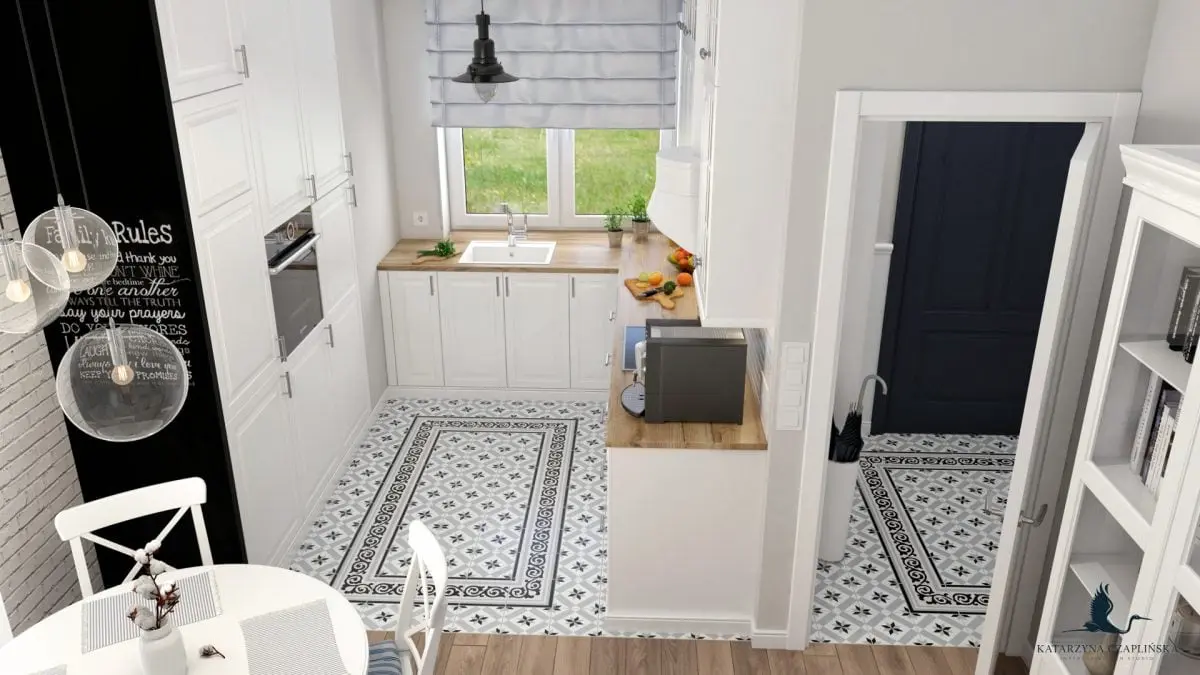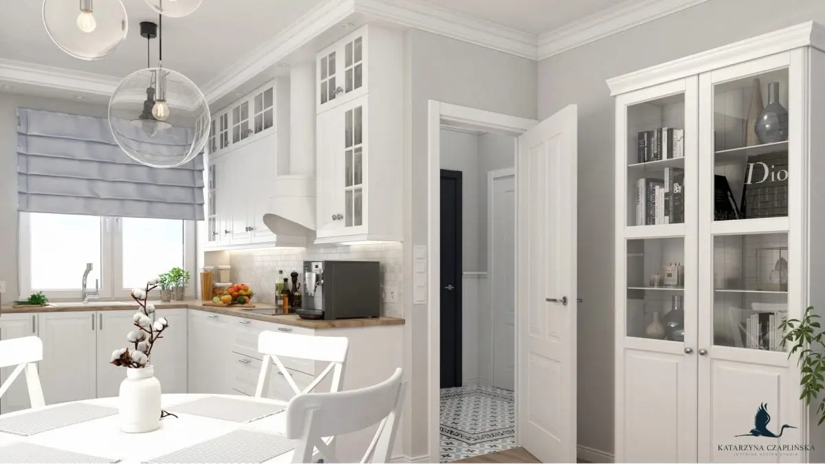 Zamysłem aranżacyjnym było, aby cały dom został utrzymany w biało – niebieskiej kolorystyce z dodatkiem naturalnego drewna. Przepiękny, harmonijny pełen ciepła i znakomitych rozwiązań aranżacyjnych z dużą ilością szaf do przechowywania. W klasycznej białej kuchni z drewnianym blatem, na ścianie położono cegiełki a na podłodze wzorzyste płytki z dodatkiem błękitu. Urządzając kuchnię w tym stylu, zazwyczaj wybieramy meble charakteryzujące się prostą formą. Architektka postanowiła nadać wnętrzu domieszki klasycznego sznytu, wybrała fronty o prostym frezowaniu oraz witrynowe.