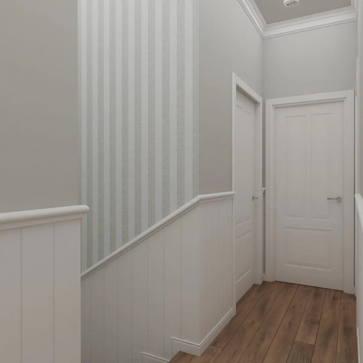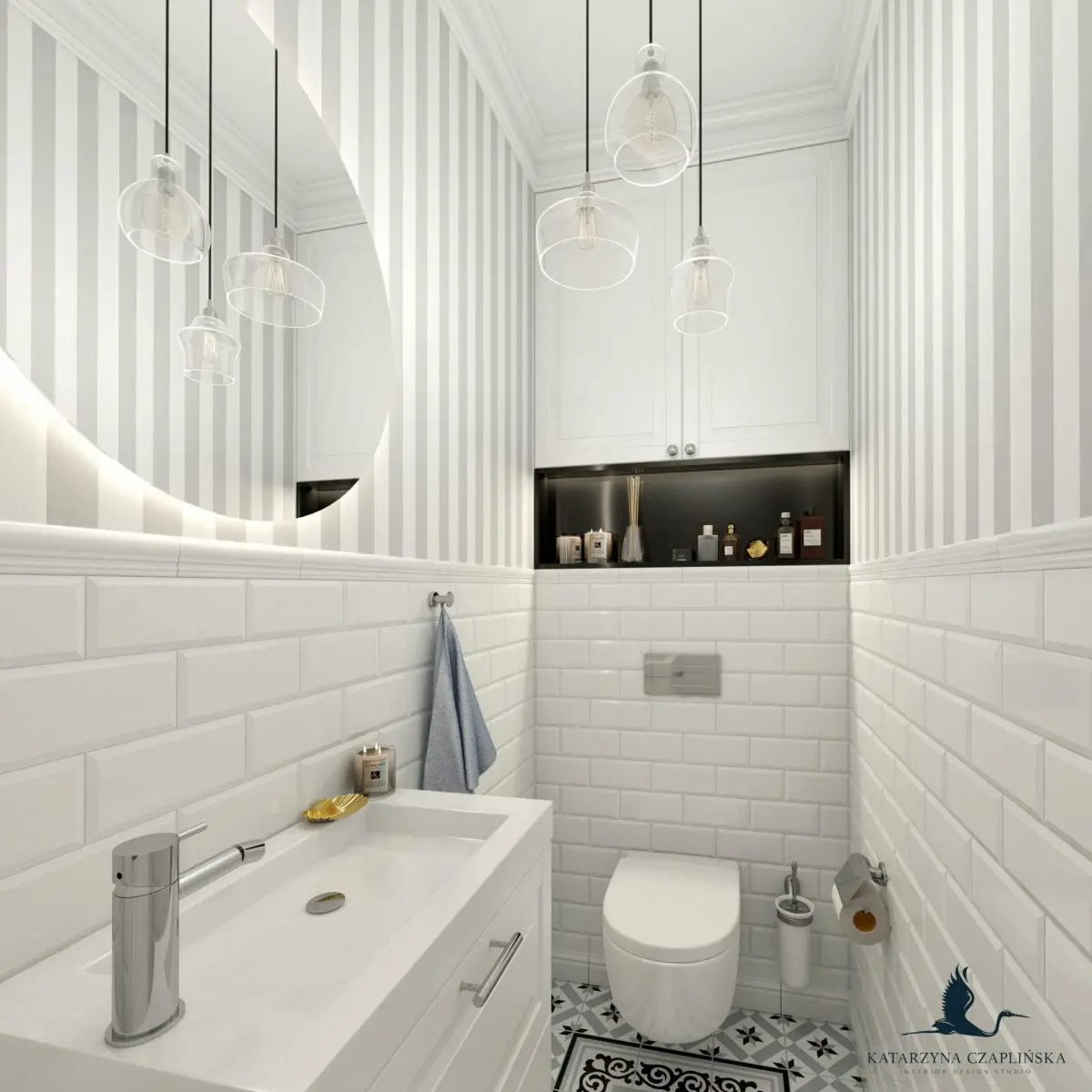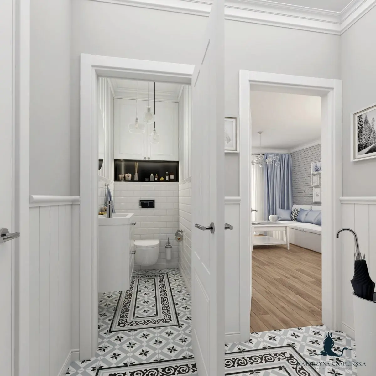 Zamysłem aranżacyjnym było, aby cały dom został utrzymany w biało – niebieskiej kolorystyce z dodatkiem naturalnego drewna. Przepiękny, harmonijny pełen ciepła i znakomitych rozwiązań aranżacyjnych z dużą ilością szaf do przechowywania. W klasycznej białej kuchni z drewnianym blatem, na ścianie położono cegiełki a na podłodze wzorzyste płytki z dodatkiem błękitu. Urządzając kuchnię w tym stylu, zazwyczaj wybieramy meble charakteryzujące się prostą formą. Architektka postanowiła nadać wnętrzu domieszki klasycznego sznytu, wybrała fronty o prostym frezowaniu oraz witrynowe.