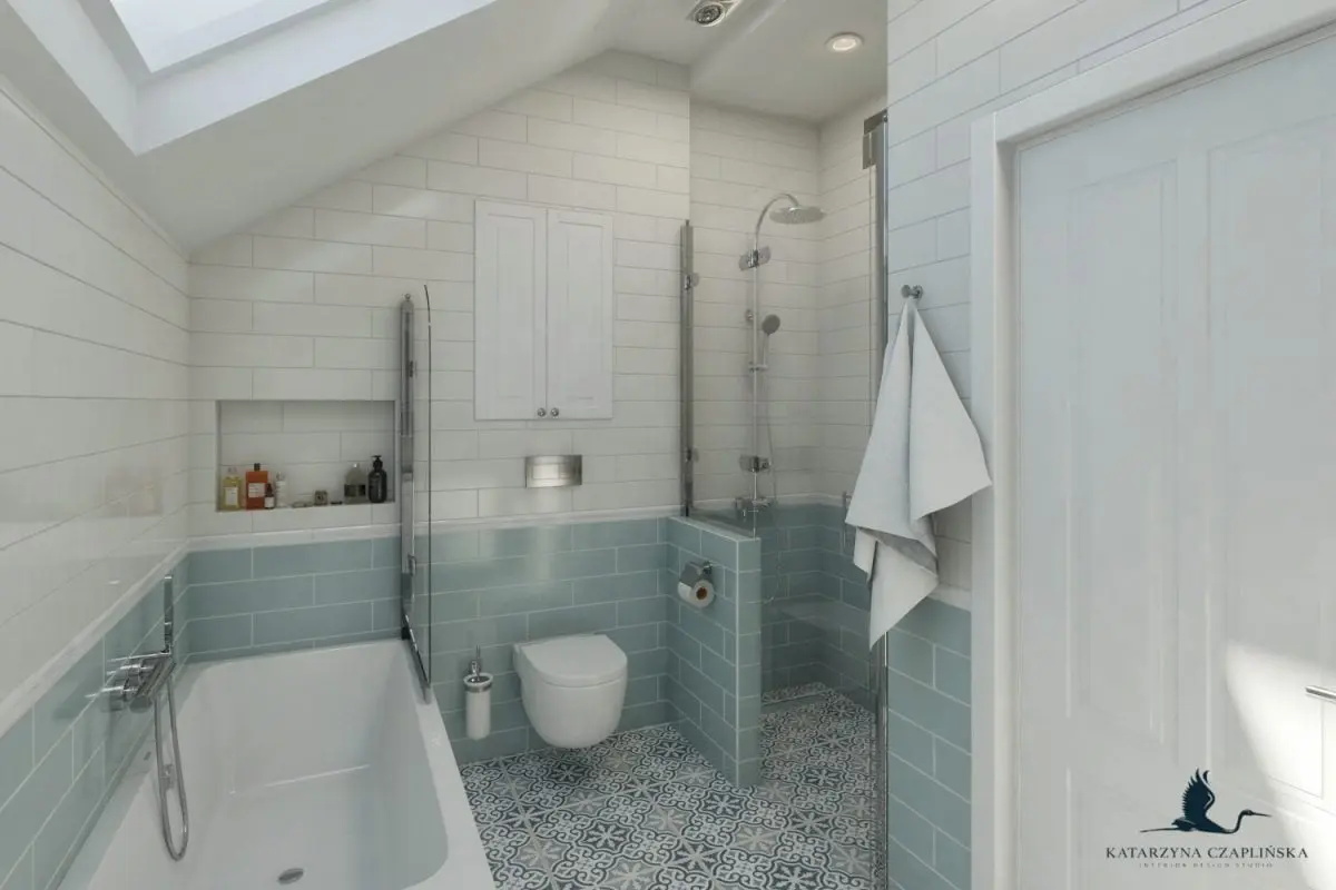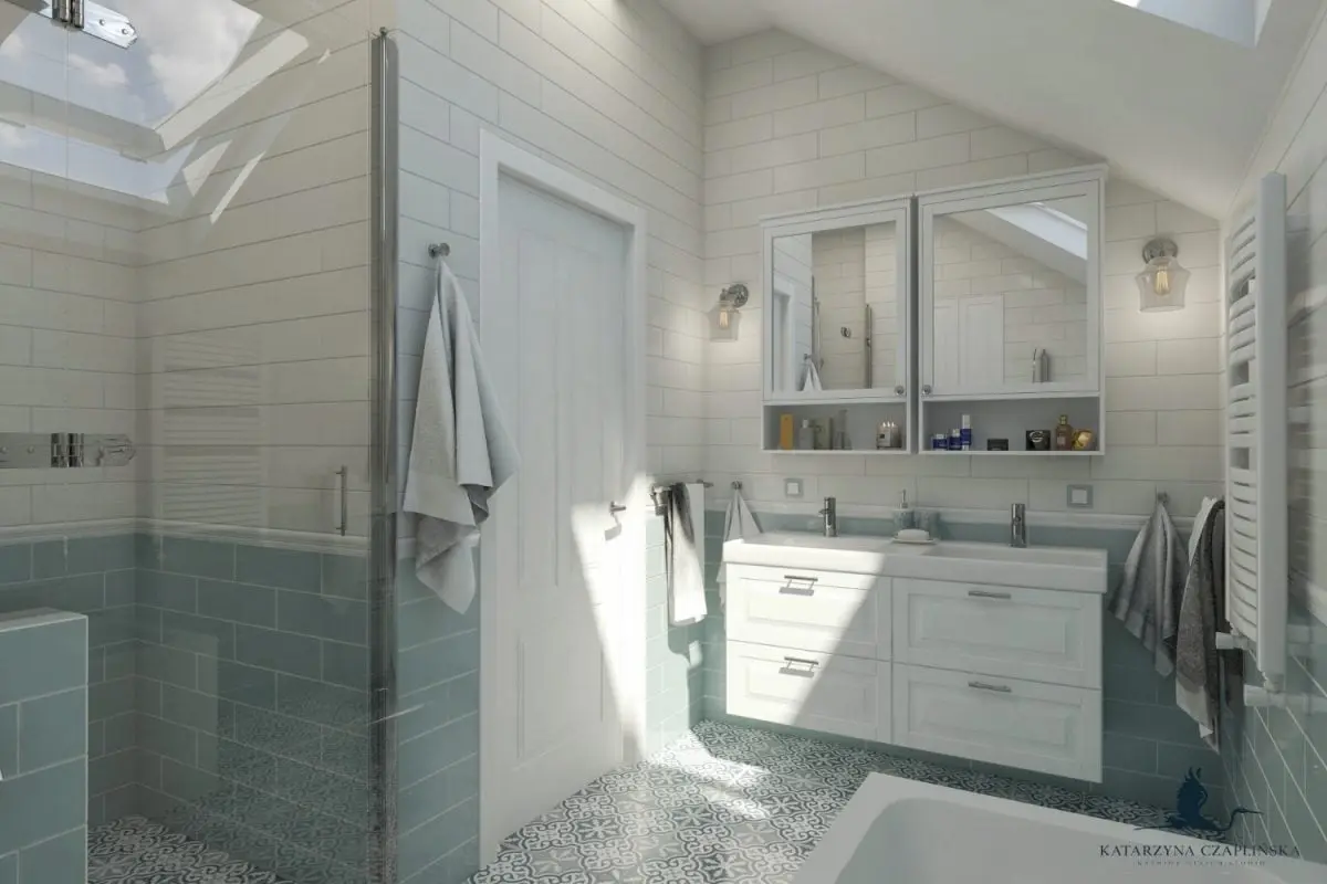 Piękna łazienka na poddaszu również utrzymana w tej samej kolorystyce co cały dom. Jasna, przytulna i zachęcająca do relaksu. Łazienka jest kwintesencją minimalistycznego designu w zgodzie z naturą.