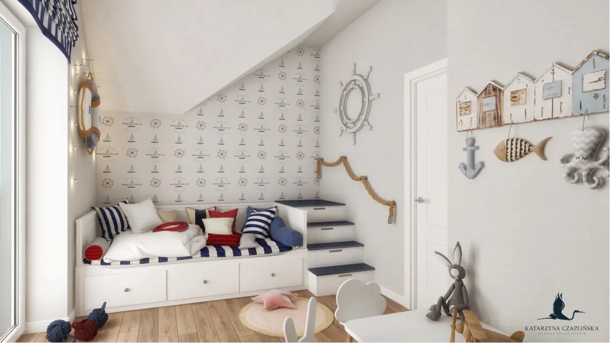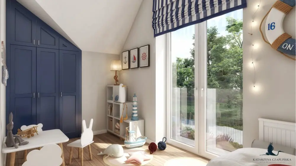 Styl marynistyczny narzuca kolorystykę – błękity, lazury, turkusy i granaty, w różnych odcieniach są tu niezbędne. Kolor niebieski uspokaja, więc dobrze, żeby dominował we wnętrzu. Błękity mogą pomóc maluchowi uspokoić się po dniu obfitującym w bodźce. Dlatego ten styl sprawdza się najlepiej w pokoju dziecięcym.