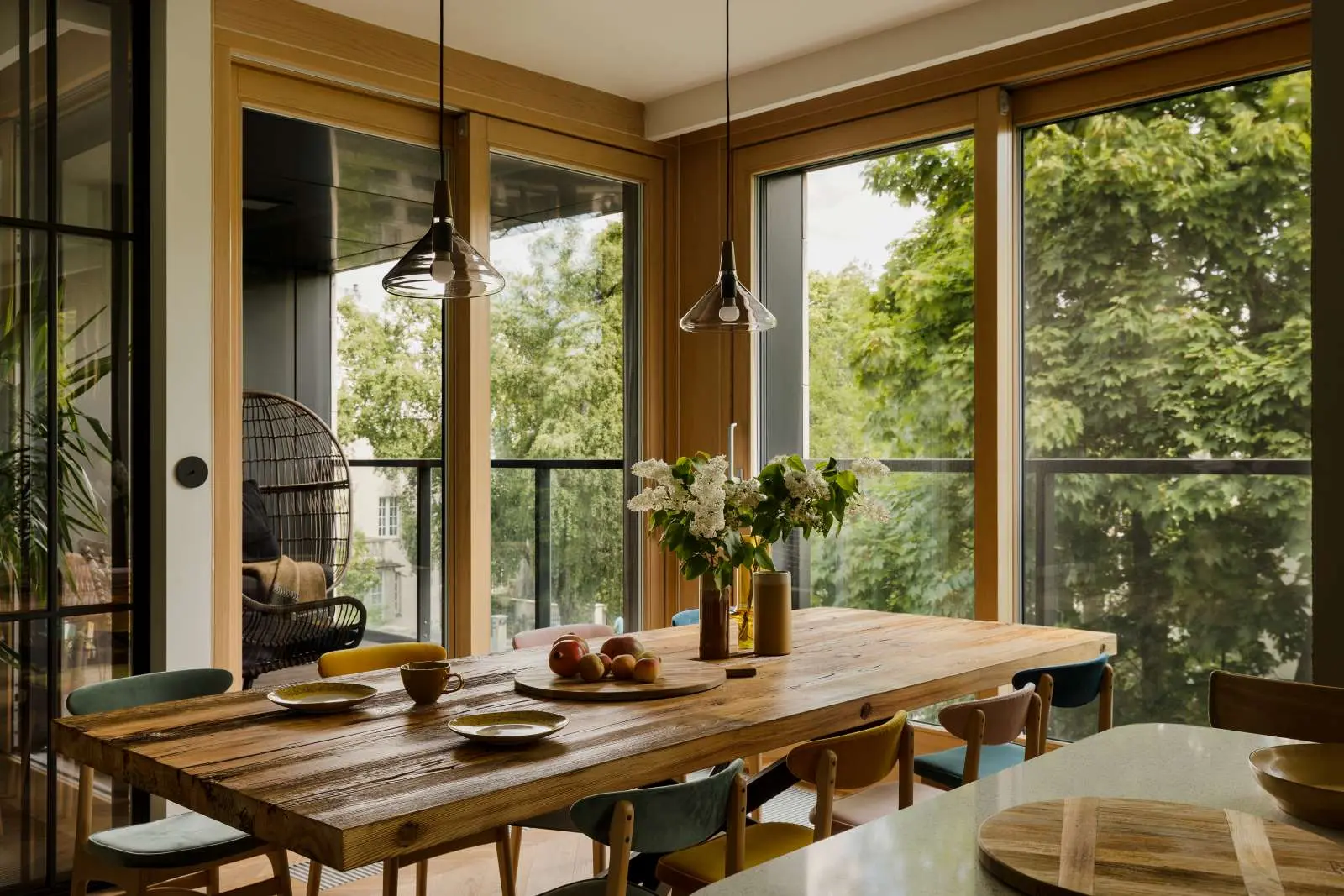 Inwestorzy od samego początku byli otwarci na ciekawe i kolorowe rozwiązania. Architektkom zależało na stworzeniu przestrzeni, która nie tylko będzie barwna, ale także domowa i elegancka. W mieszkaniu zostały wplecione elementy vintage, jak chociażby odnowione krzesła z PRL-u Hałasy nawiązujące kolorystycznie do barw w całym mieszkaniu.