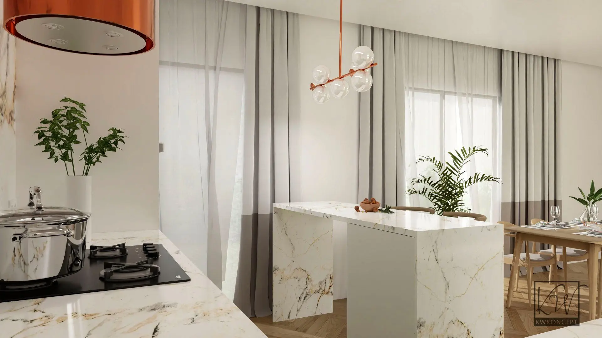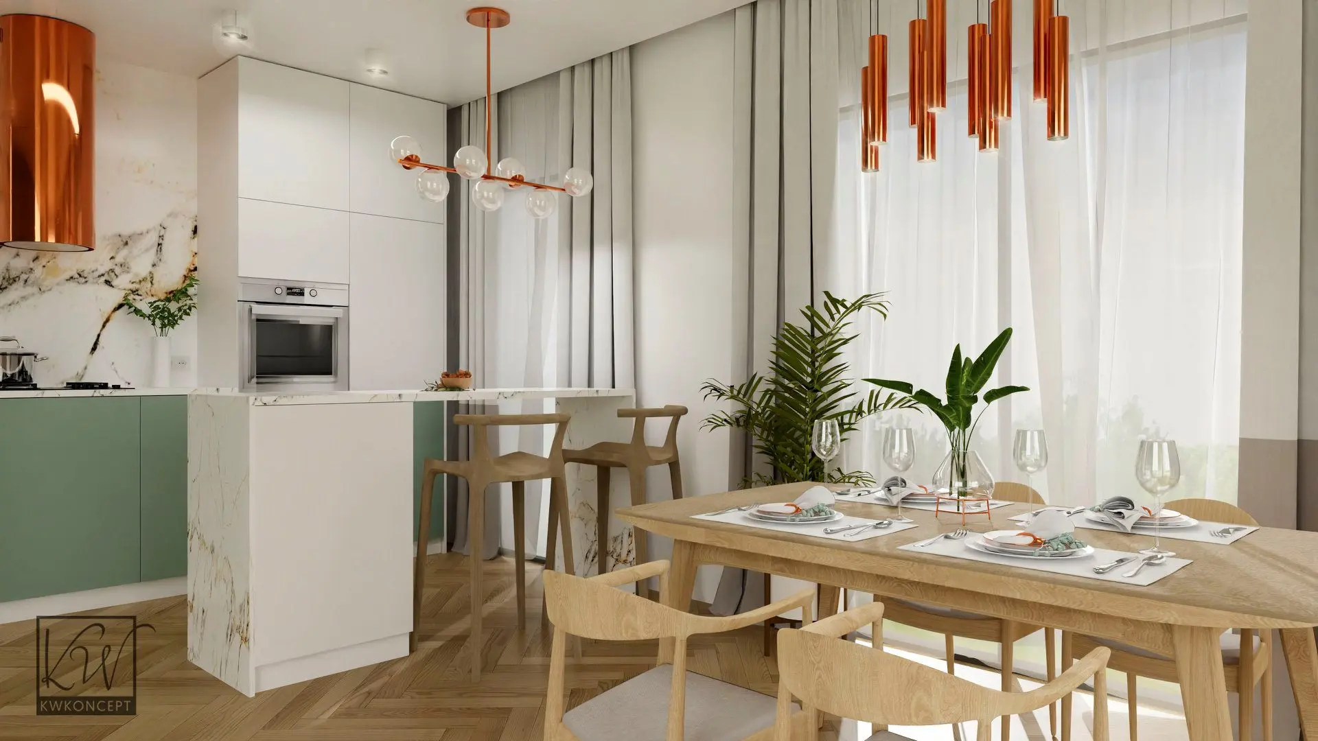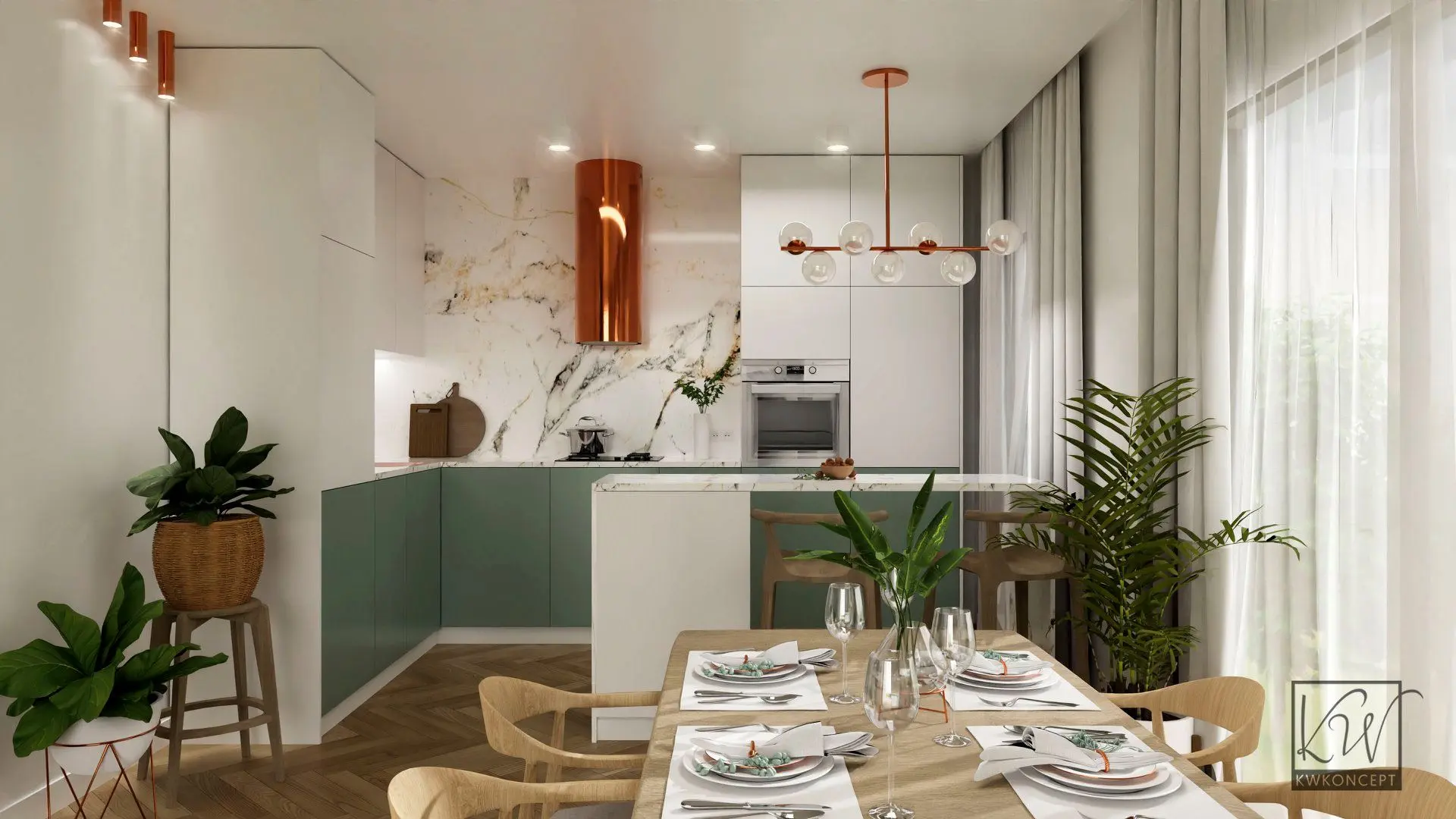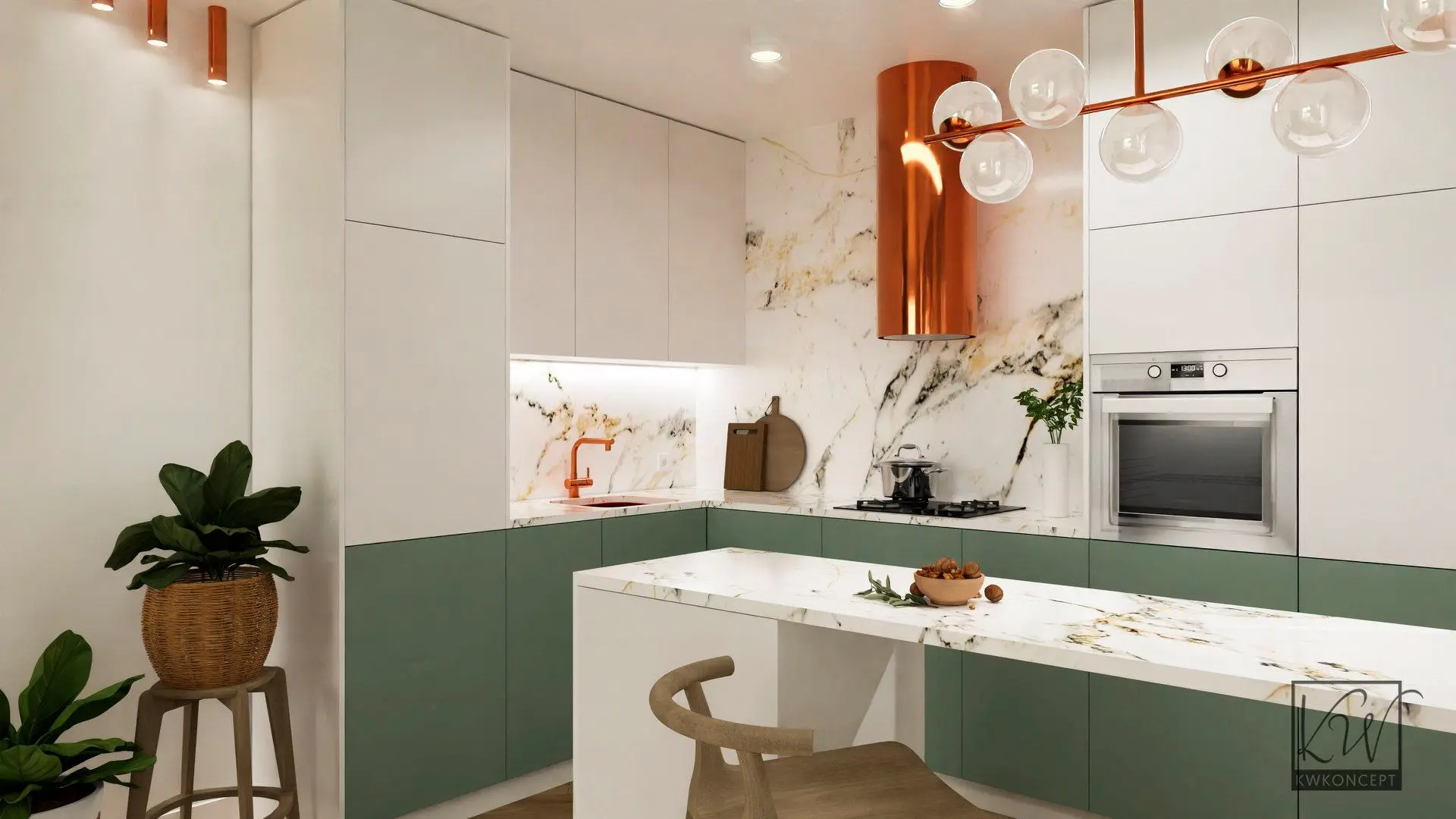 Piasek, słońce, zieleń, beztroska. Klimat wakacji chcielibyśmy czuć przez cały rok. Co zrobić, by w naszym domu zagościło lato? Do biura projektowego Kwkoncept zgłosiło się młode małżeństwo po projekt kuchni o pow. 12m2. Głównym założeniem projektowym było stworzenie jasnej kuchni w klimatach boho. Niecodzienne połączenie kolorystyki bieli, zieleni oraz miedzi wprowadza nas w wakacyjne klimaty. Całość została uzupełniona elementami drewnianymi oraz ratanowymi. W zaprojektowanej kuchni zastosowaliśmy proste lakierowane fronty, które stanowią tło dla pięknego spieku. Widoczne żyłki w odcieniach złota, miedzi dodają wnętrzu charakteru. W projektowanej kuchni zaplanowano wyspę z miejscami do siedzenia. Nad wyspą wisi modernistyczna lampa. Wspomniany wcześniej miedziany kolor zastosowano w wyposażeniu kuchni tj. zlew podwieszany, bateria, okap.