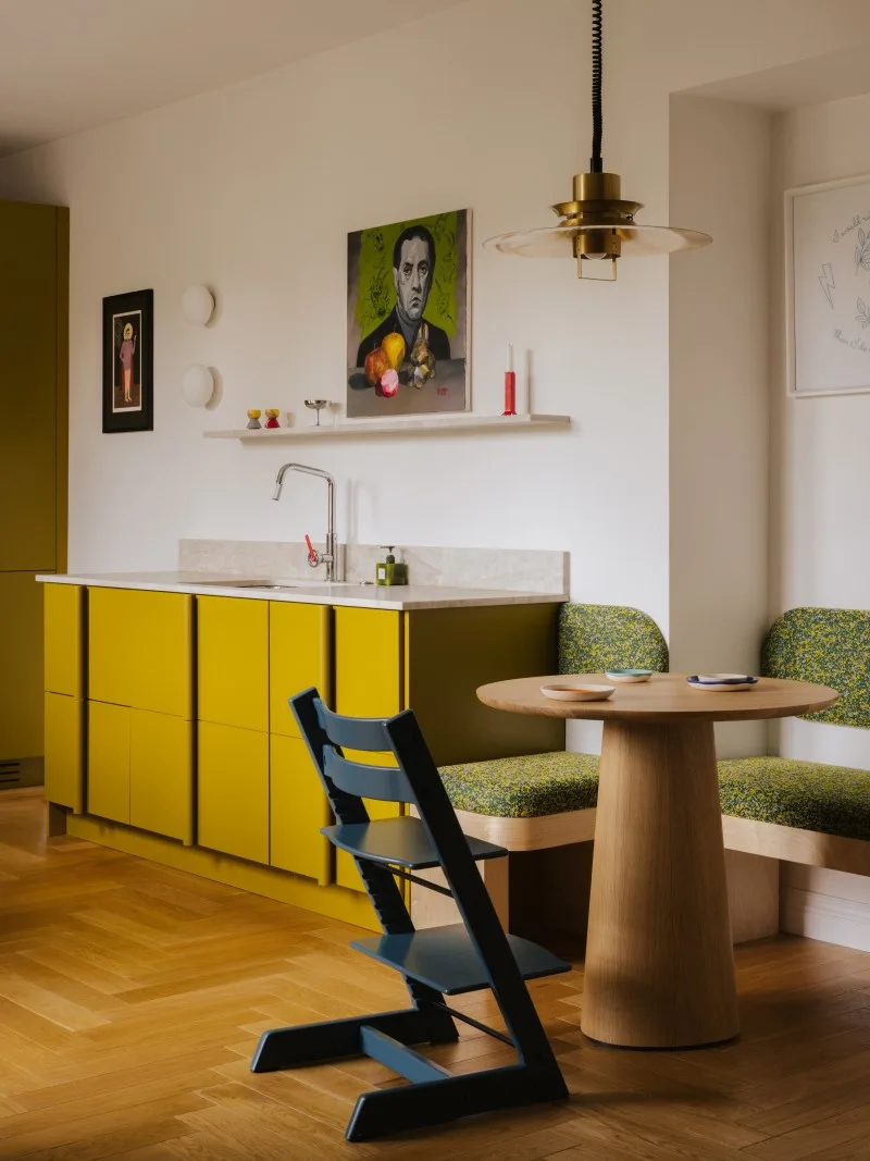 Sporym zaskoczeniem jest kuchnia z musztardowymi frontami, które dopełniono przestrzennymi uchwytami. Na blacie natomiast zastosowano kamienny blat Taj Mahal. Mrugnięciem oka w stronę odbiorcy jest czerwony akcept w postaci baterii kuchennej Gessi.