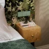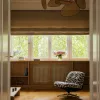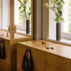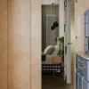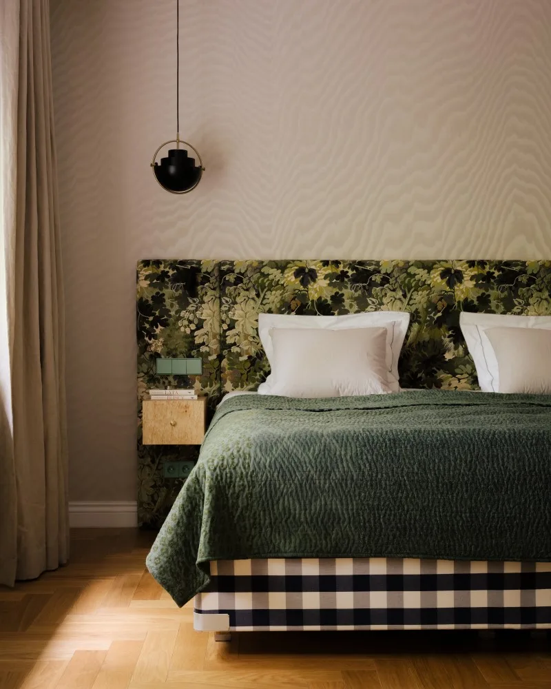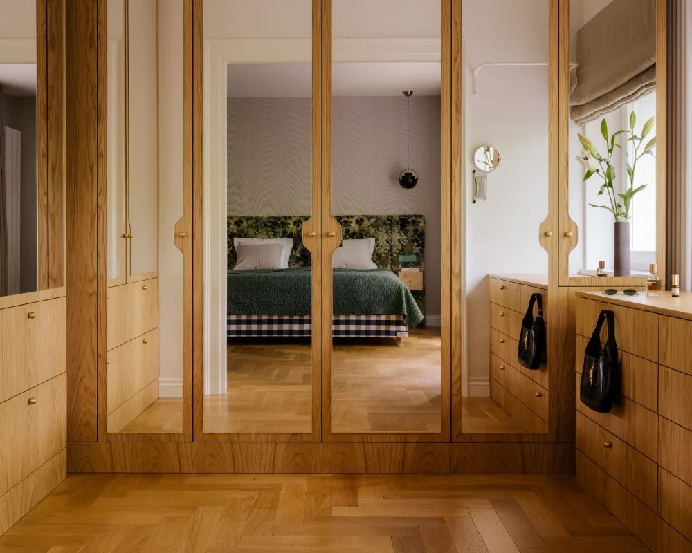 Druga część mieszkania — niegdyś służbówka — dzięki niższemu stropowi i mniejszym oknom wychodzącym na bujną zieleń od razu wprowadza spokojniejszy rytm. W sypialni wokół łóżka Hästens zbudowano przytulną, wielowarstwową scenografię: zagłówek obito tkaniną Pierre Frey w leśny wzór, a całość otula subtelny połysk tapety Dedar. Meble z czeczoty, zasłony z grubego lnu i wiszące lampy Gubi współtworzą elegancką, a jednocześnie bardzo osobistą atmosferę. Z sypialni amfiladowe przejście prowadzi do garderoby w dębowym fornirze, doświetlonej naturalnym światłem i wykończonej lustrami o wyrafinowanych detalach.