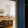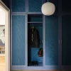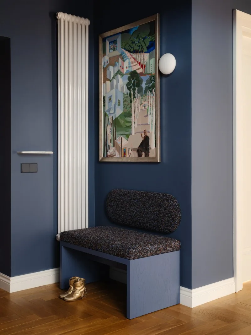 Przedpokój jest preludium tego projektu – niczym pierwsza nuta wprowadza nas w jego kolorystykę i atmosferę, które rozwijają się w kolejnych pomieszczeniach. I choć nie ma tu okna, architektki, aby osiągnąć pożądany efekt, zastosowały ciemny granat. Źródłami przytłumionego, ciepłego i matowego światła są sufitowa lampa Fabbian i ścienny model Nemo Le Corbusiera. Monochromatyczny charakter wnętrza przełamują tapeta oraz ławka obita tkaniną Kvadrat projektu Rafaela Simonsa.