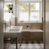 Nawiązania do klimatu francuskich kamienic pojawiają się również w łazienkach – szczególnie wyraźne w aranżacji ścian i podłóg. Zastosowano tu tradycyjne kwadratowe płytki na podłodze, tworzące dekoracyjne wzory oraz szklistą ceramikę na ścianach. Aranżację dopełniają stalowe detale przy umywalce.