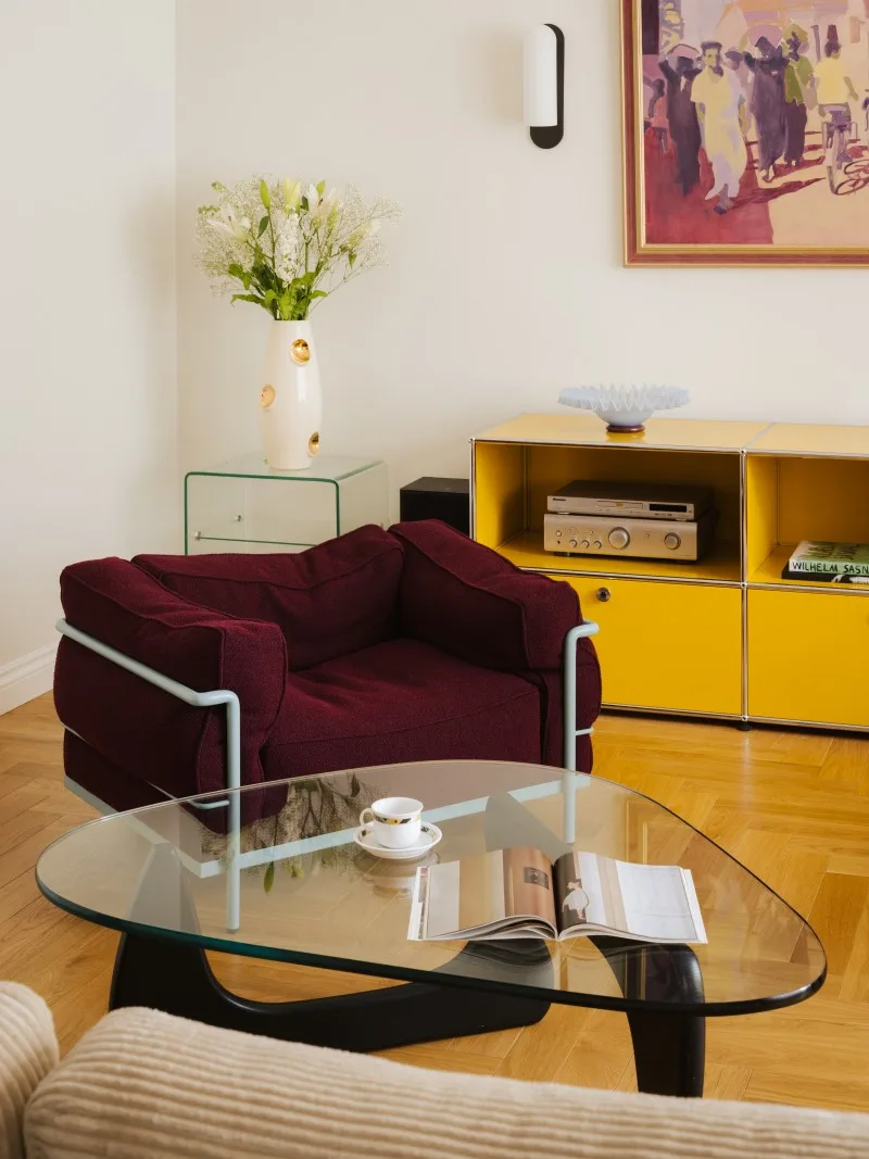 We wnętrzu znajdziemy wiele ikon światowego designu, takich jak fotel LC2 z bordowym obiciem i stelażem lakierowanym na matowy błękit, stolik Noguchi czy ciemnoburgundowe krzesła Bruno Rey. Aby jednak dodać przestrzeni bardziej osobistego charakteru, ściany zdobią obrazy z rodzinnej kolekcji, a zamiast telewizora zaprojektowano półki na książki. Nie bez znaczenia dla całego projektu są także wyselekcjonowane lampy z oferty showroomów Internity Home. To one – wraz z dopieszczonymi detalami – tworzą nie tylko piękną scenografię lecz także dopełnienie prawdziwego życia.