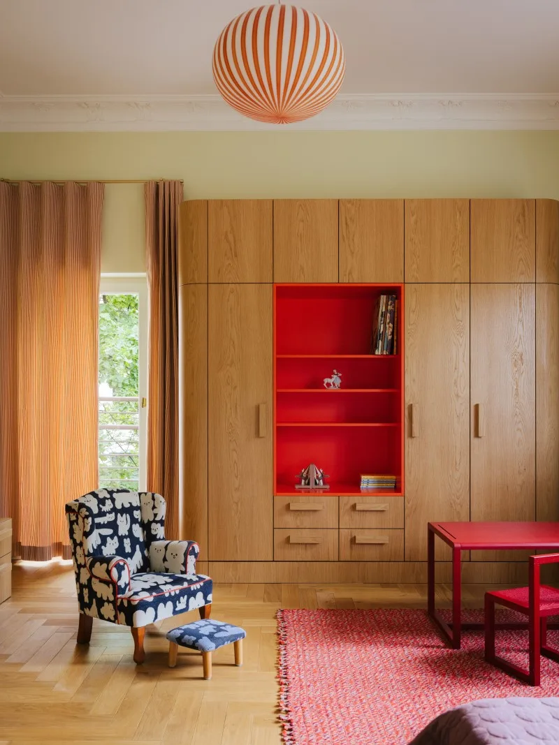 Kolory, światło i sztuka – ta wielowarstwowa narracja stała się tłem codzienności czteroosobowej rodziny. Wszystko to z poszanowaniem historii miejsca. Jesteśmy na ostatnim piętrze kamienicy na Starym Mokotowie, gdzie po połączeniu dwóch lokali powstał 160 – metrowy apartament. Projekt zrealizowano we współpracy Studio Zemła z architektką Olgą Guz.