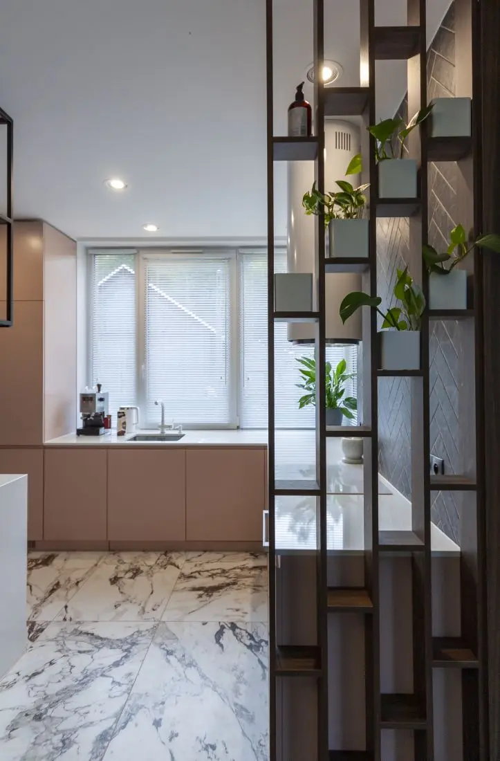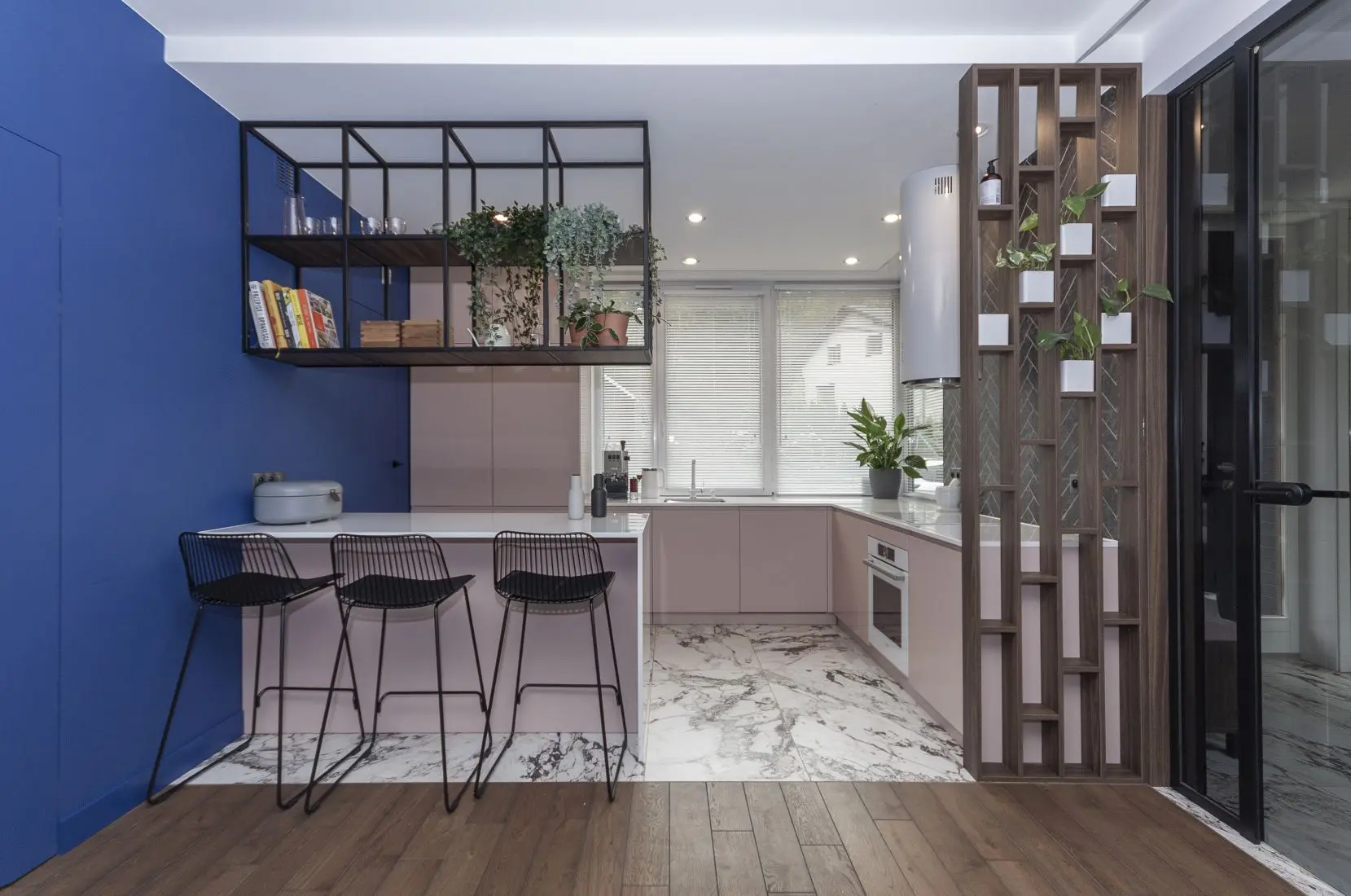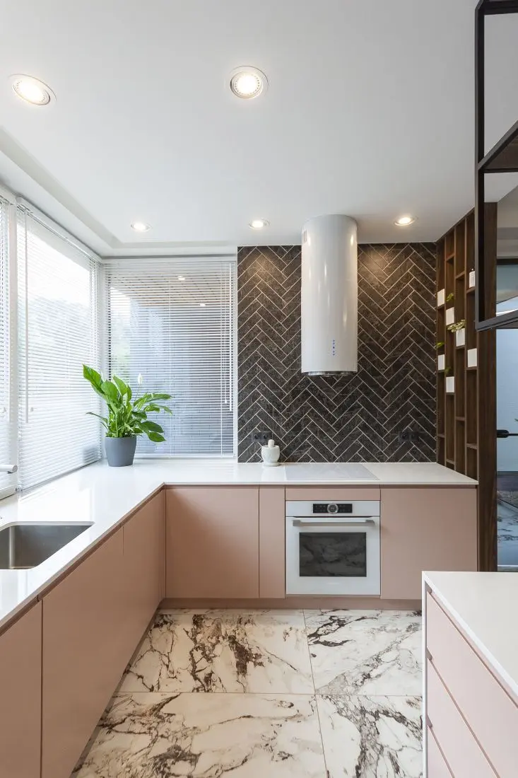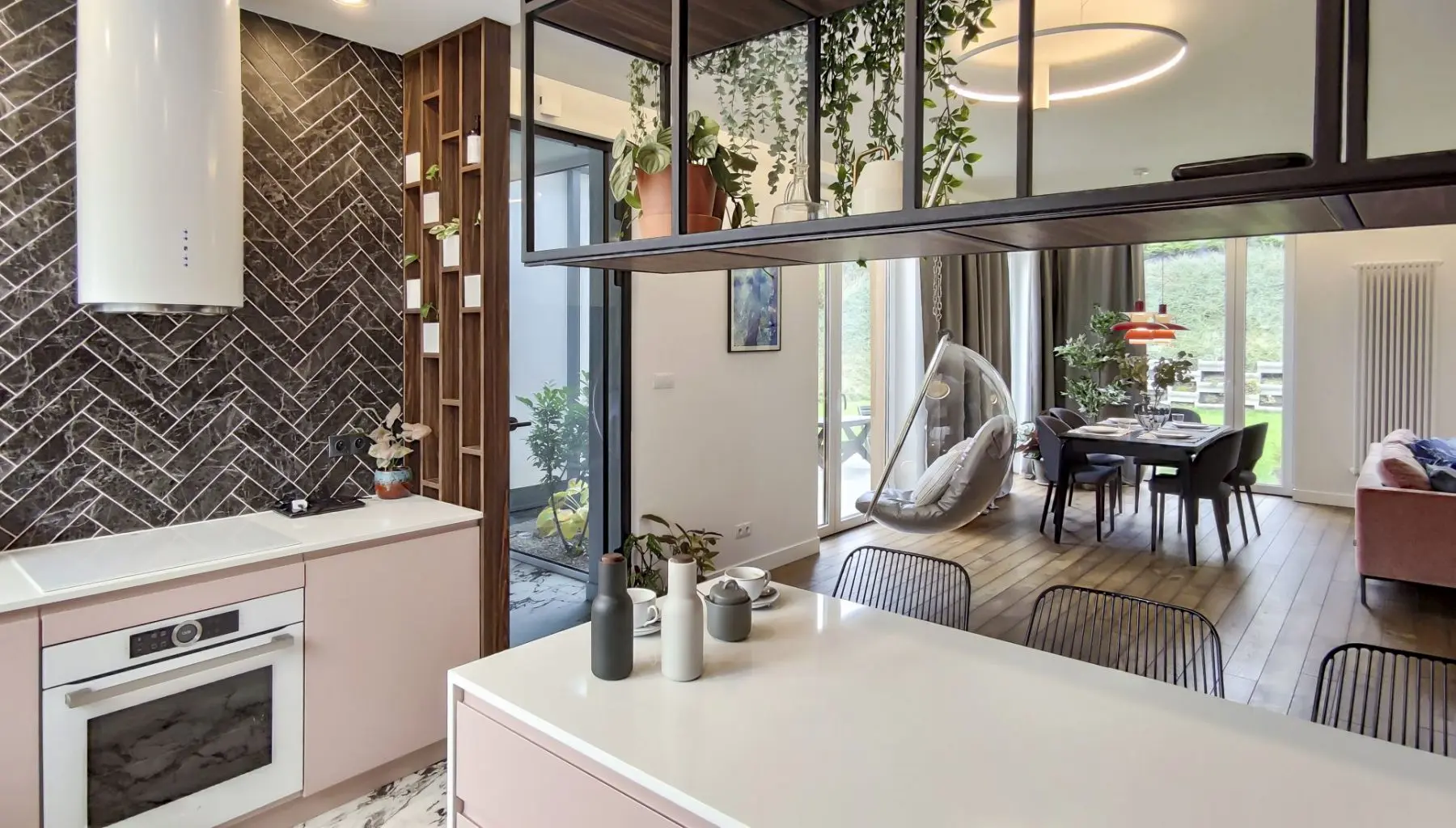 Kuchnia miała być jasna i elegancka. Zabudowa meblowa z pudrowo różowymi frontami zestawiona jest z białymi kamiennymi blatami, białym sprzętem AGD i marmurowymi płytkami. Jest lekko przesłonięta od industrialnych drzwi wejściowych poprzez drewniany ażur z miejscem na doniczki z ziołami. Nad wyspą znajduje się stalowa zabudowa, która stanowi jednocześnie półkę na kieliszki oraz dekoracje z wiszącej zieleni. Podobnie jak ażur, to bardzo plastyczny element całej kuchni.