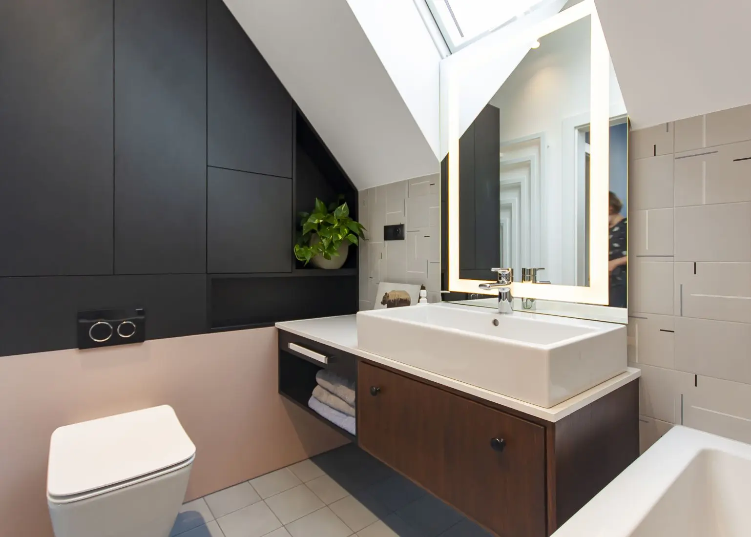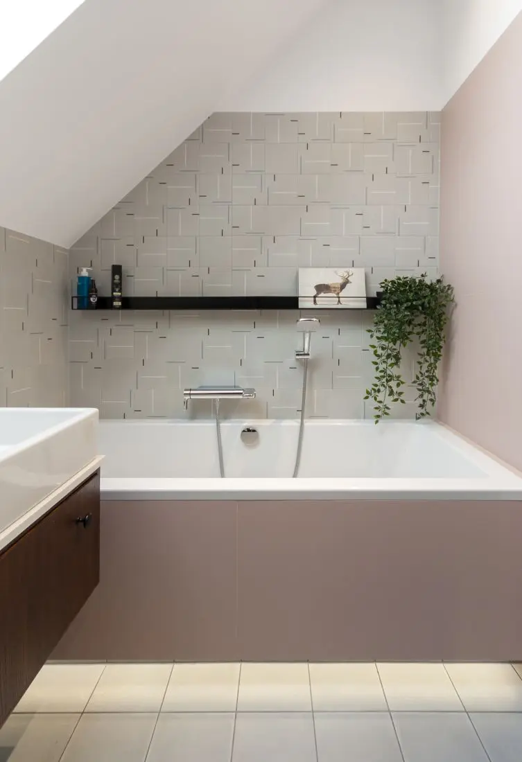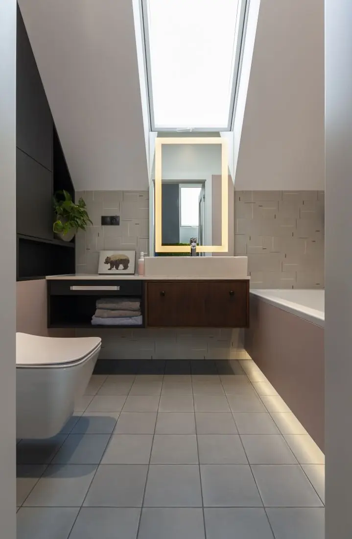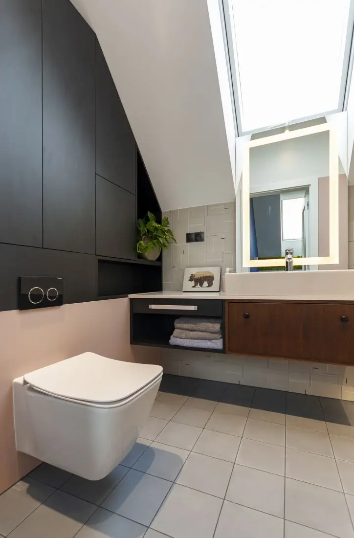 Łazienka na poddaszu to efekt świetnych połączeń moodboardowych podczas fazy wyboru materiałów. Rzadko się zdarza, by płytki różnych producentów, o różnych formatach tak bardzo ze sobą się zgrały. Pozornie nie pasujące do siebie materiały zestawione razem w jednym wnętrzu dały niesamowity efekt. Początkowy układ łazienki zaproponowany przez dewelopera został całkowicie zmodyfikowany tak, by podkreślić okno dachowe i połączyć je z lustrem przy umywalce.