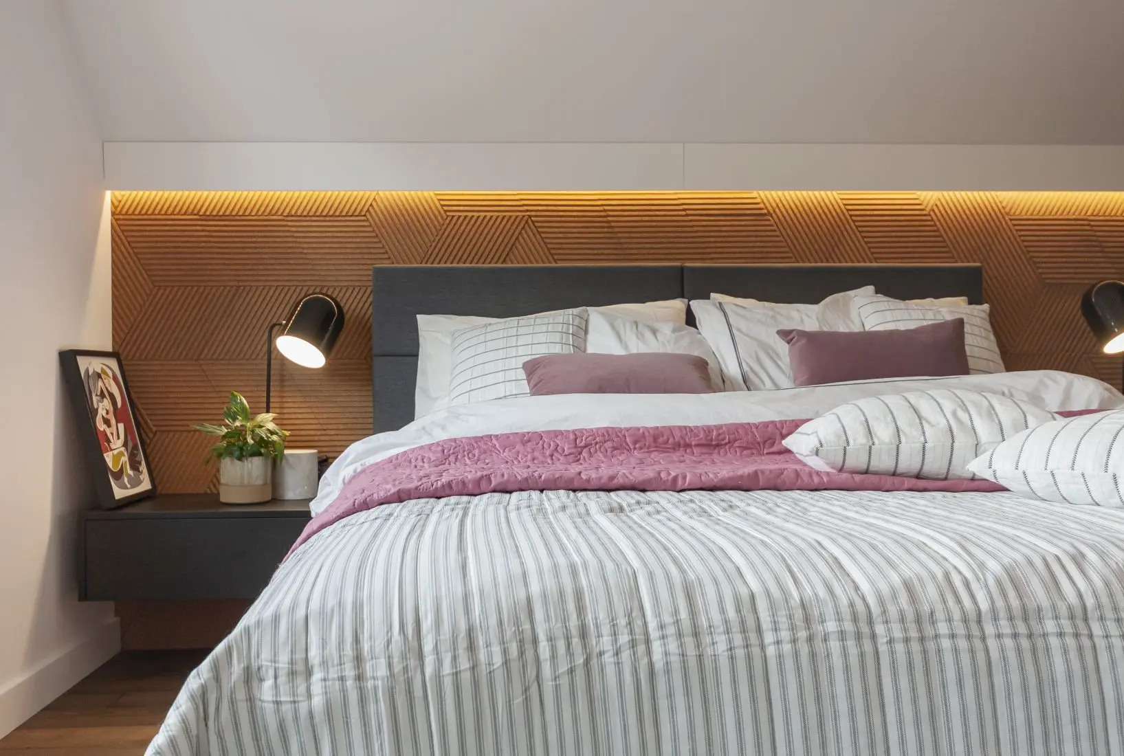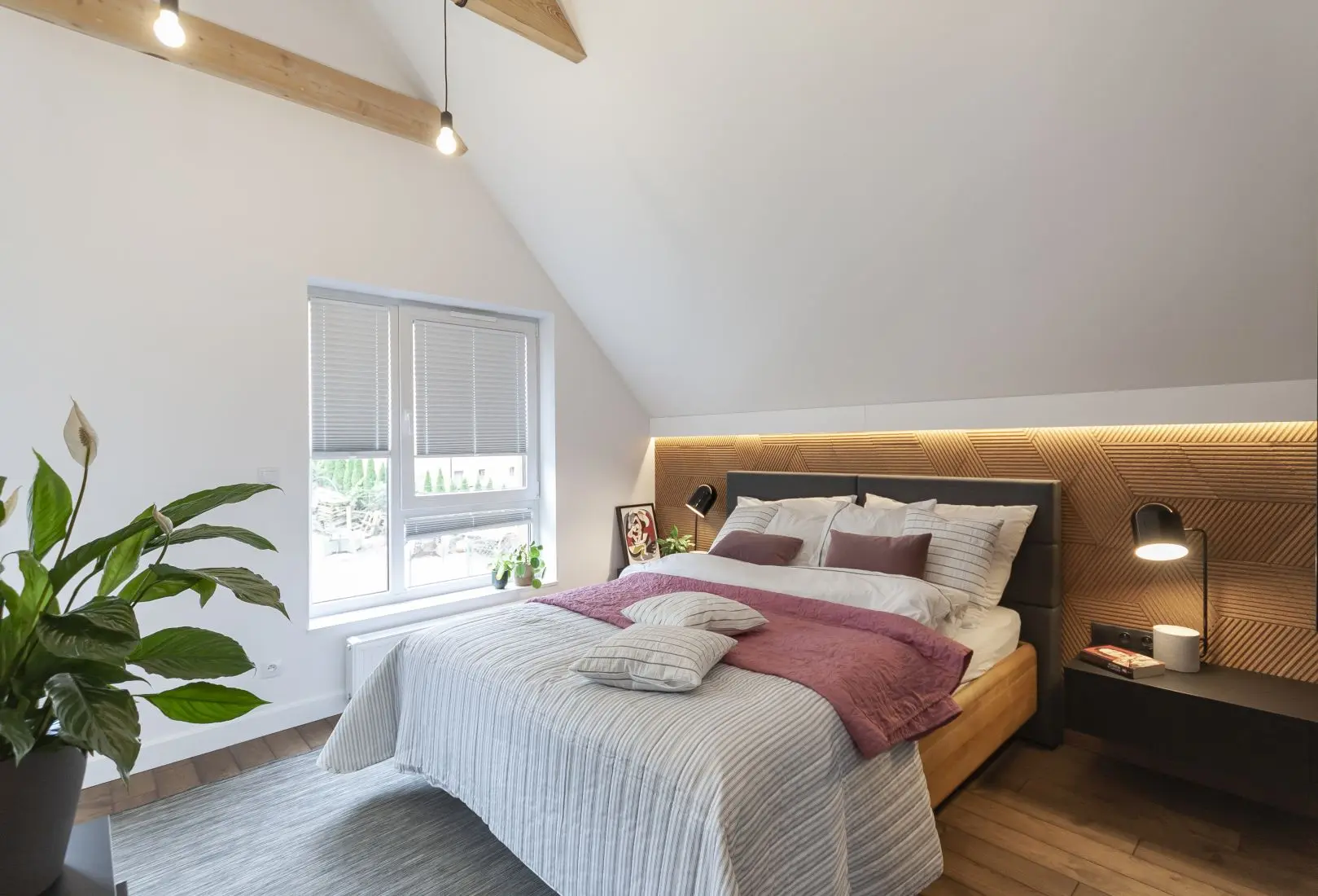 Do strefy prywatnej, czyli na piętro domu prowadzą drewniane schody wybarwione w kolorze podłogi drewnianej. Zamiast typowej balustrady są oddzielone od strefy wypoczynkowej drewnianym ażurem, podobnym do tego przy kuchni. Na piętrze znajdują się sypialnie oraz łazienka. Główna sypialnia mieści funkcjonalną garderobę z toaletką dla Inwestorki. Kwiatowy motyw na tapecie oraz korkowy zagłówek to dwa główne akcenty przykuwające uwagę w tym pomieszczeniu.