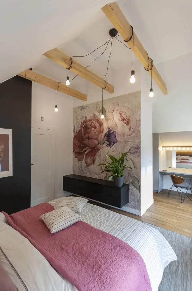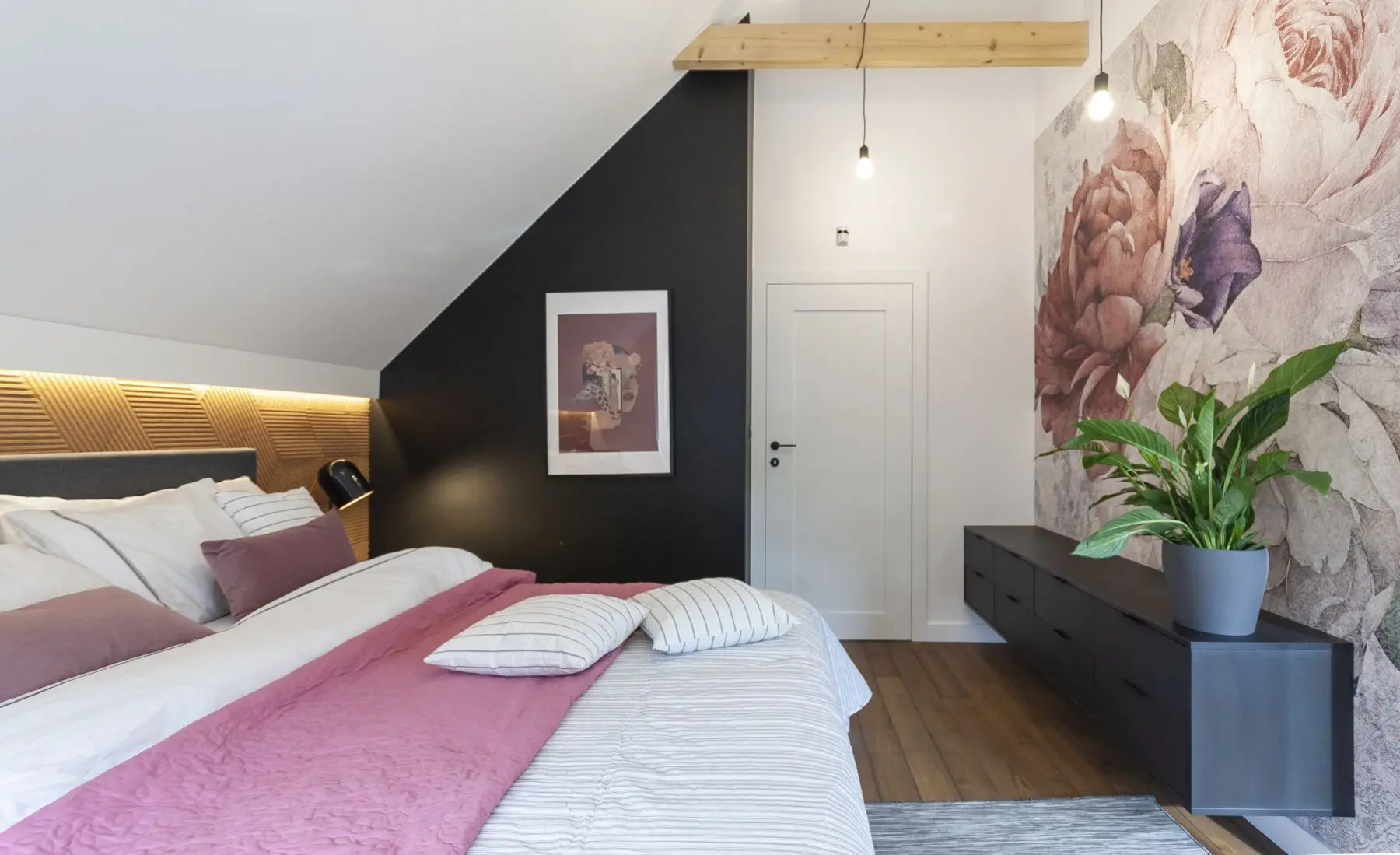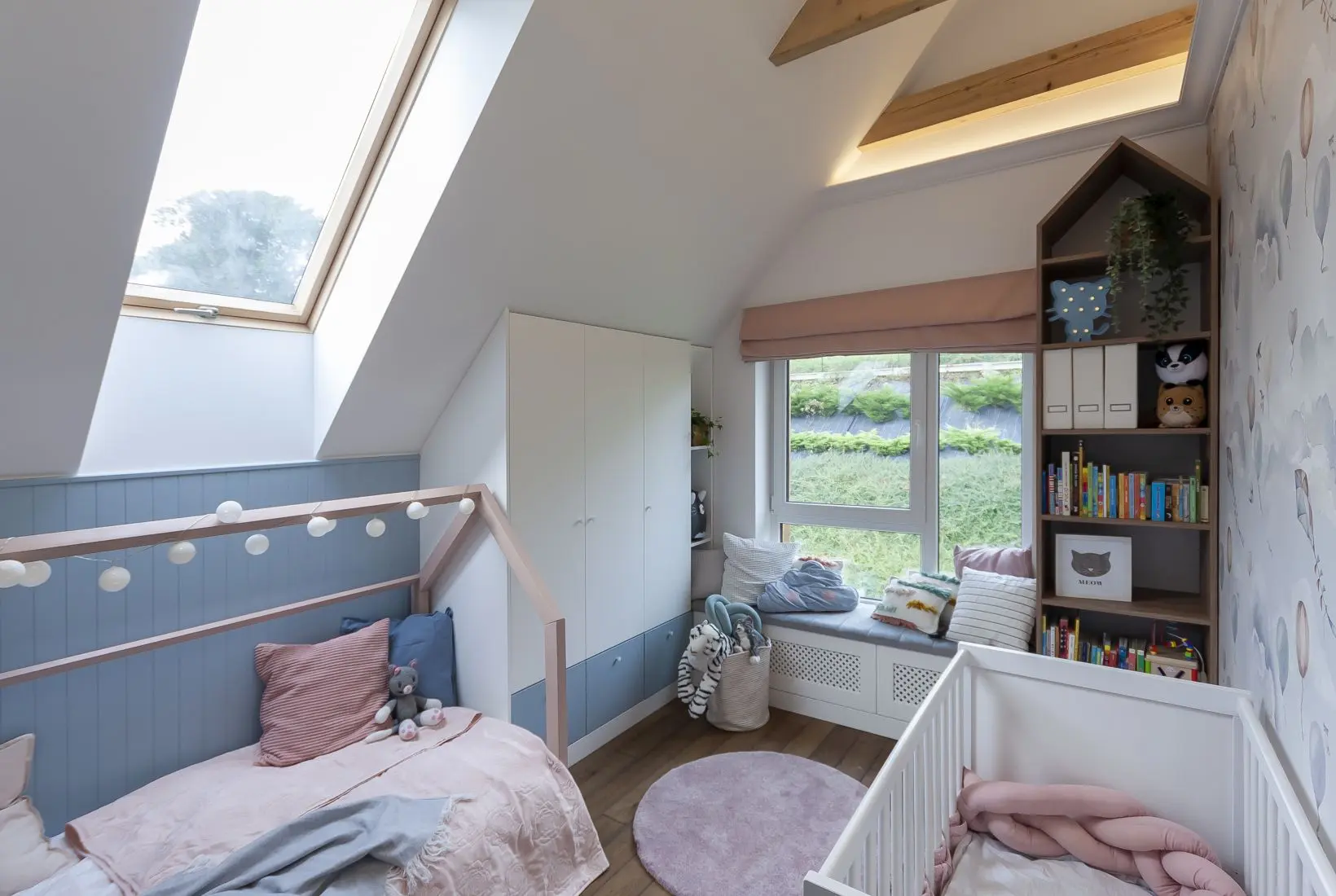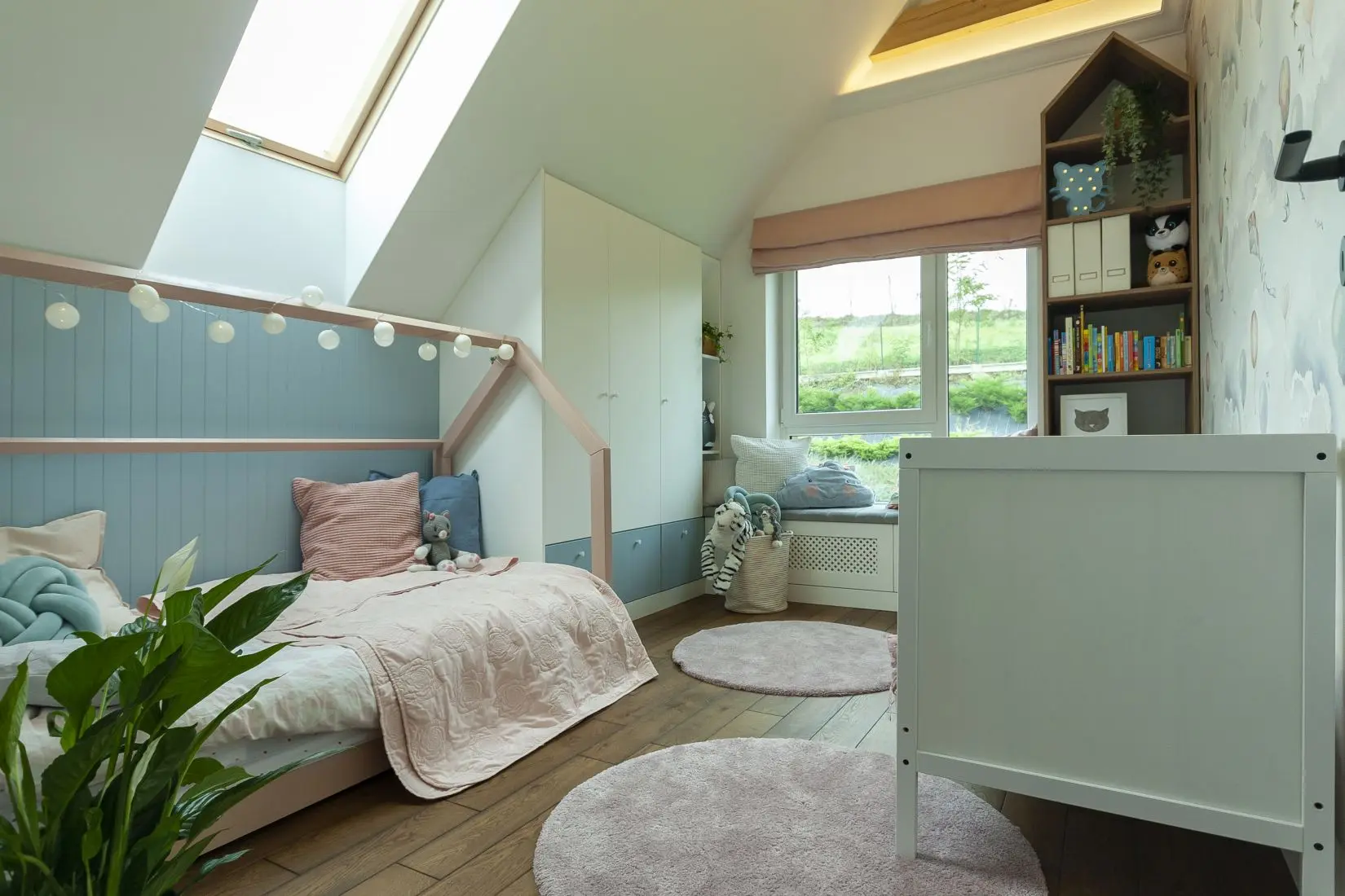 Pokój córeczki Klientów był projektowany tuż przed jej narodzinami. Pastelowa tapeta w balony to element, który nie powinien się szybko znudzić, postawiliśmy na otwartą przestrzeń z widocznymi belkami od dachu, które kiedyś można wykorzystać do zawieszenia huśtawki-hamaka.