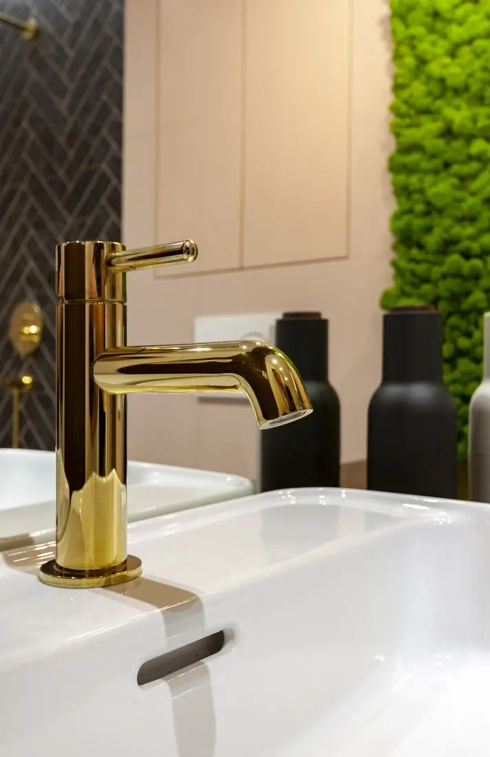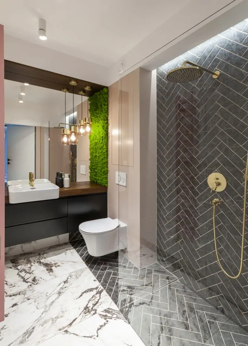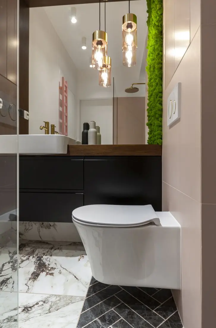 Łazienka na parterze, która kiedyś była tylko toaletą, została przeprojektowana tak, by mogła pomieścić kabinę prysznicową. Użyta kolorystyka i materiały są spójne dla całej przestrzeni parteru. Jedynym elementem akcentującym łazienkę jest złota armatura.