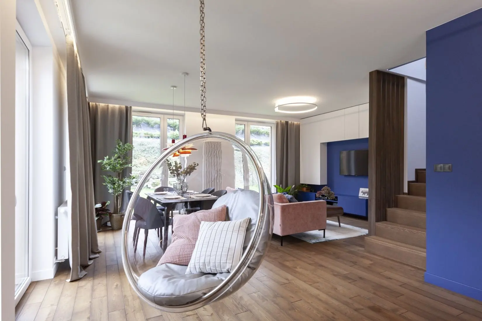 Część dzienna podzielona jest na strefy kuchenną z wyspą na szybkie śniadanie i jadalniano-salonową. Gdzieś pomiędzy jest strefa buforowa, której głównym akcentem stała się kultowa huśtawka bubble chair. Kącik wypoczynkowy zdobi różowa sofa od Sits zestawiona z granatową ścianą i zabudową na wymiar, również w tym kolorze. Stolik kawowy to element lekko retro, pod nim połyskuje szaro-niebieskawy dywan o przyjemnym miękkim włosiu.