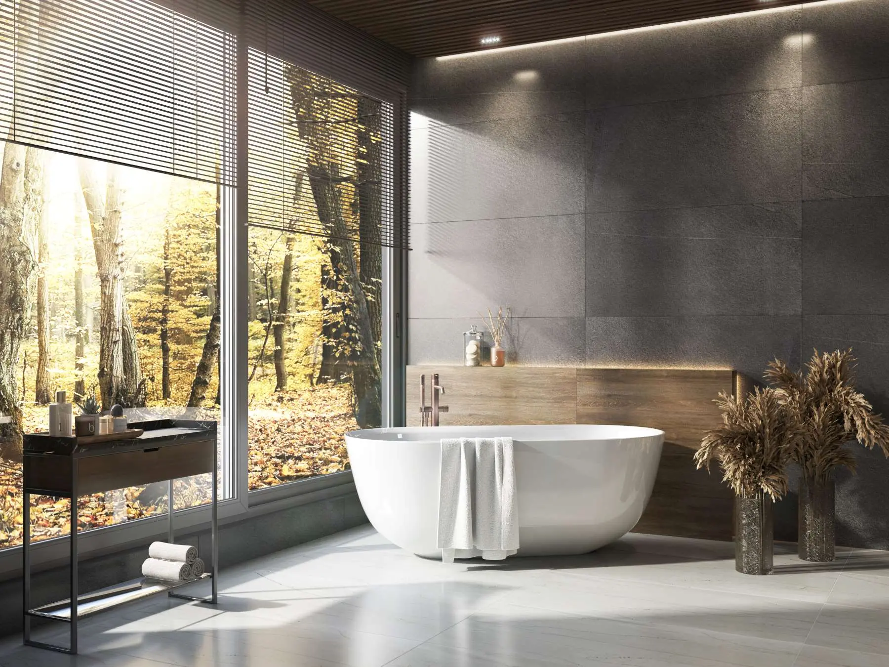 Łazienki, tak jak i inne pomieszczenia w domu, urzekają wyglądem i funkcjonalnością. O ich klimacie w dużej mierze decydują płytki ceramiczne, a najważniejszym celem aranżacyjnym było stworzenie eleganckiego, surowego a zarazem ciepłego wnętrza. Postawiono na kamień i drewno z oferty Internity Home. Łazienki są harmonijne i spójne z resztą domu. Efekt jaki osiągnięto jest niesamowity, a dzięki dużym oknom czuć bliskość otaczającej nas przyrody.