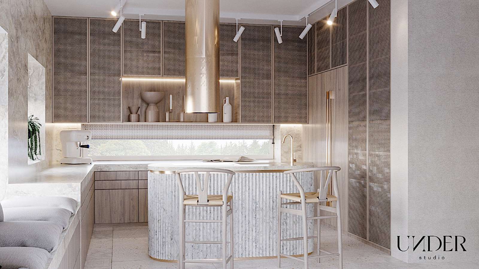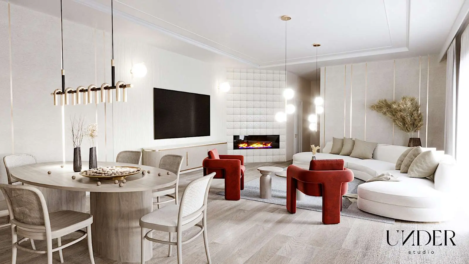 Obłe formy oraz nieregularne miękkie linie, zdominowały ostatnio projekty mebli. Duża, zaokrąglona sofa i fotele, wręcz zapraszają, by się na nich relaksować. Te zaokrąglenia nawiązują do stylu Art Deco. Jasna harmonijna przestrzeń z klimatycznym kominkiem została podkreślona mocnym akcentem w postaci foteli. Złote elementy nawiązujące do stylu glamour odnajdziemy w nowoczesnej lampie zawieszonej nad drewnianym owalnym stołem oraz w pionowych dekoracyjnych pasach na ścianie.