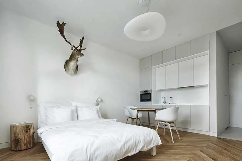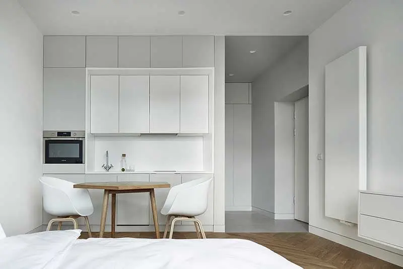 Mieszkanie zostało utrzymane w konwencji przytulnego minimalizmu. W strefie dziennej króluje biel, która optycznie powiększa pomieszczenie. W tym kolorze został również utrzymany monochromatyczny aneks kuchenny, wtopiony w jedną ze ścian. Dominują tu oszczędne, proste formy, a jedynymi nawiązaniem do klasyki są tu podłoga z parkietem ułożonym we francuską jodełkę oraz elegancki fotel.