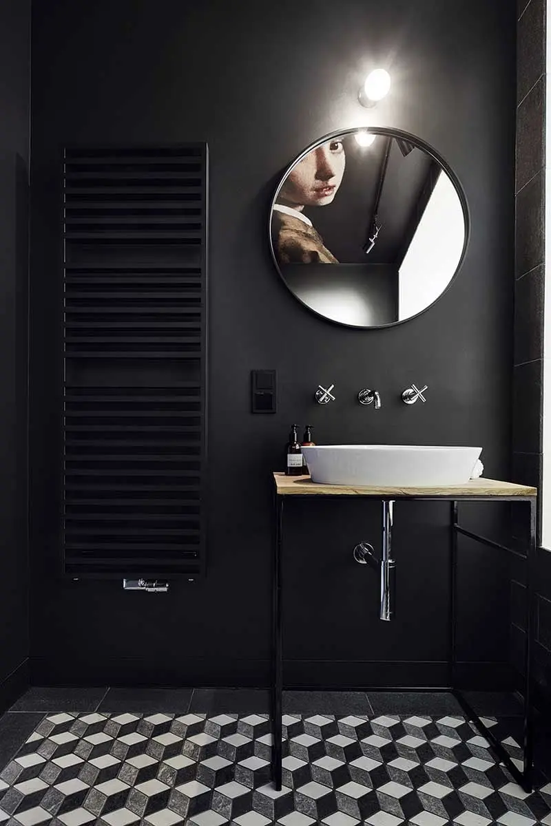 Salon kąpielowy jest zaskoczeniem i zupełnym przeciwieństwem strefy dziennej. Tu dominuje czerń, geometria i sztuka. Z sufitu spogląda “Dziewczyna z perłą” Johannesa Vermeera (reprodukcja w formie muralu), który odbija się w dużym, okrągłym lustrze. Na ścianie znajduje się czarny grzejnik VASCO, który idealnie komponuje się z pomieszczeniem. Podłogę zdobi posadzka z naturalnego kamienia ułożona w geometryczny wzór. Na wprost drzwi znajduje się jasna wnęka z wanną.