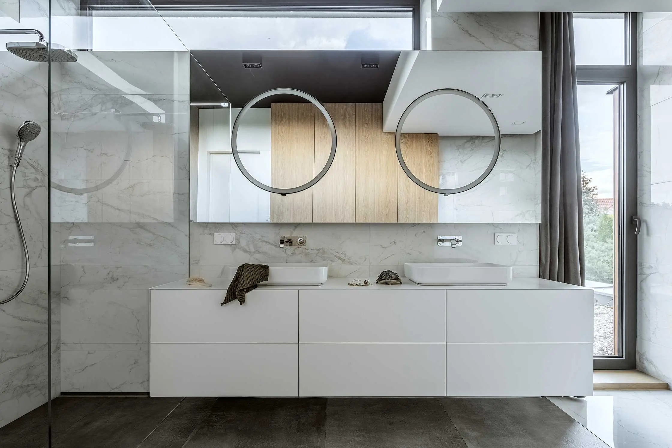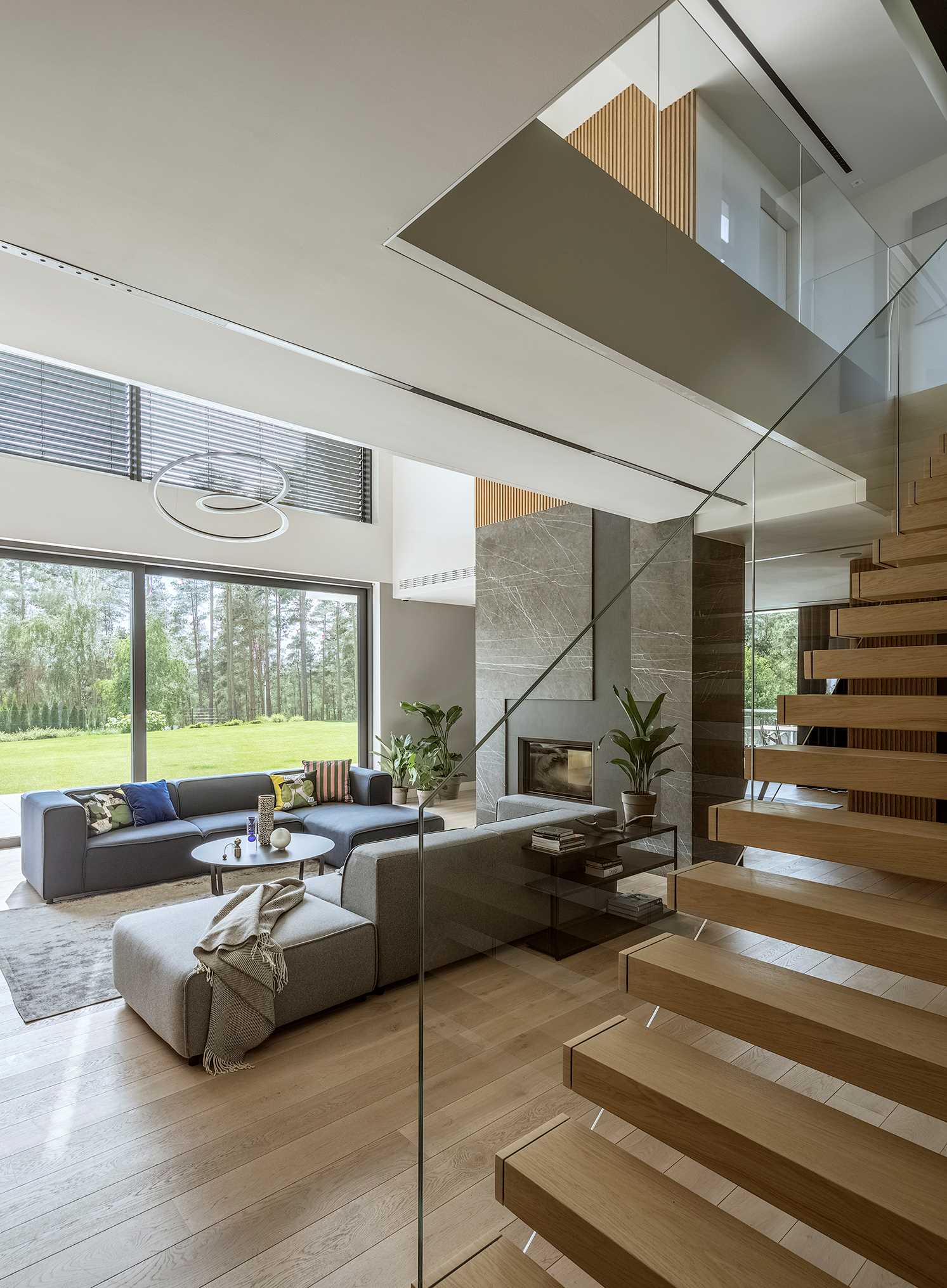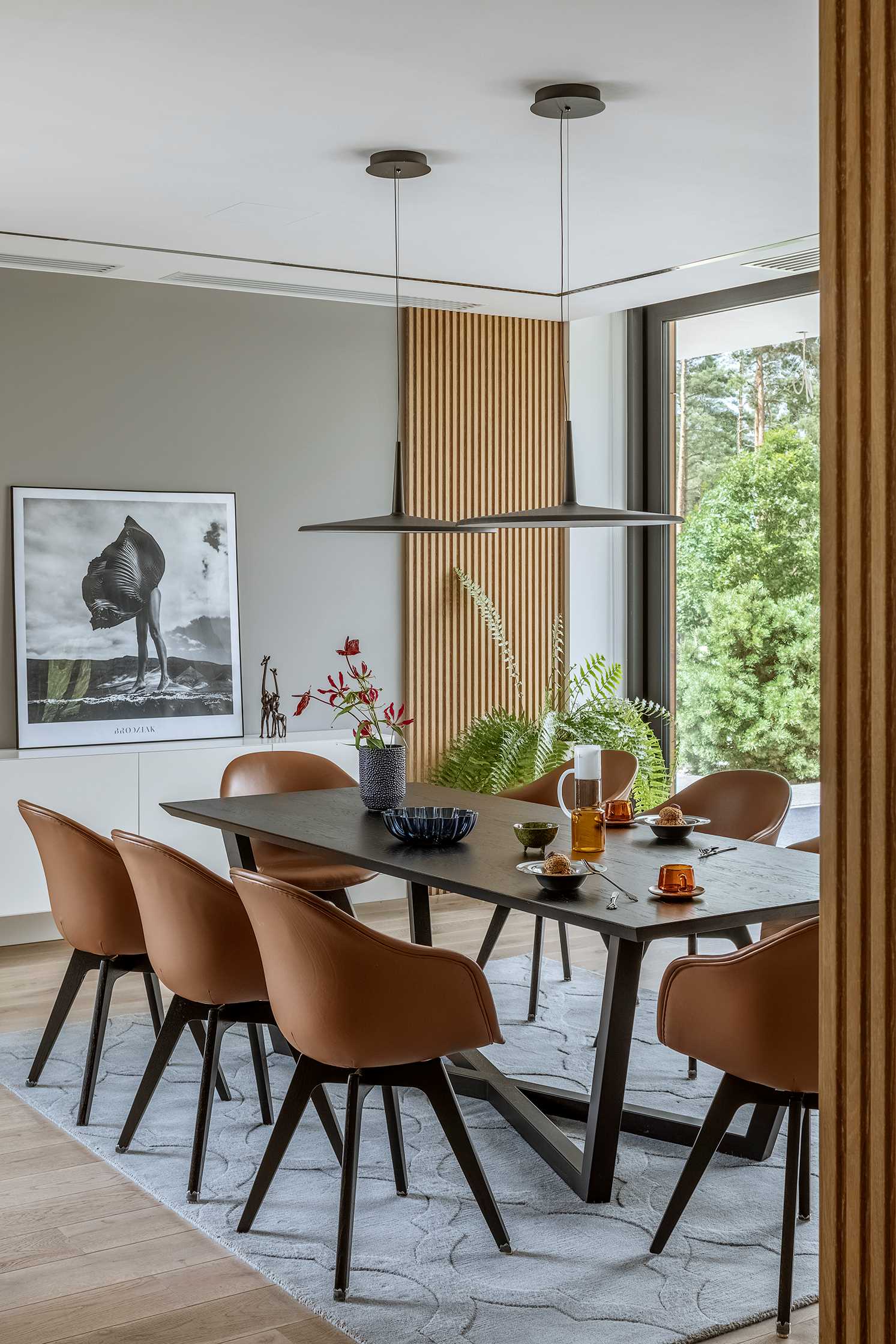 Projekt rodzinnego domu opracowany został na podstawie szczegółowych wytycznych Inwestora oraz architekta budynku. Niezwykle harmonijne wnętrze, które zostało wplecione w otaczającą go przyrodą. W projekcie wykorzystano wysokiej jakości materiały nawiązujące do naturalnych produktów. Przewodnie kolory to naturalne drewno, szarości przechodzące delikatnie w biel. Wszystko znakomicie ze sobą się komponuje tworząc idealny dom.