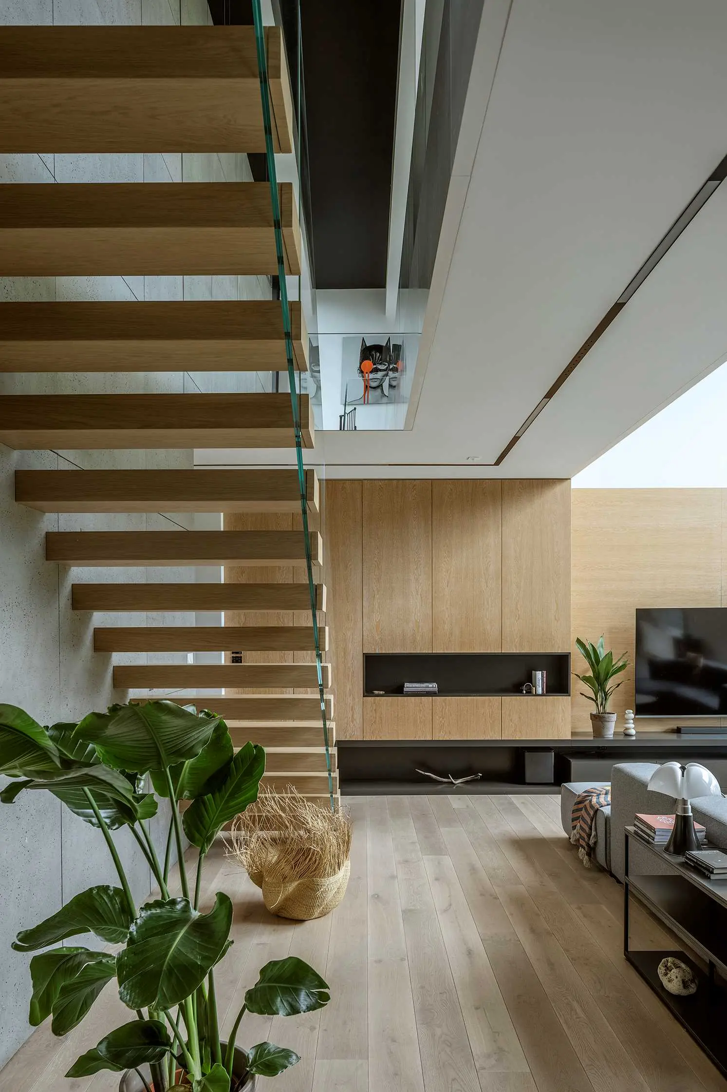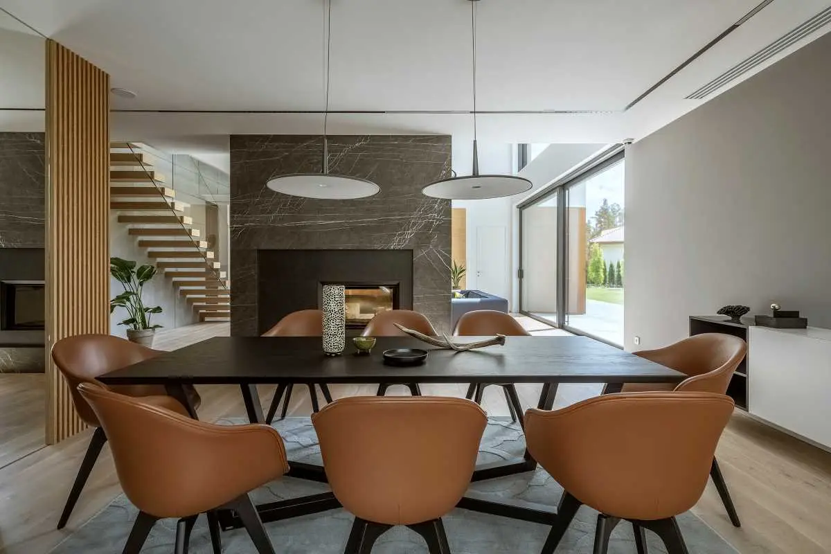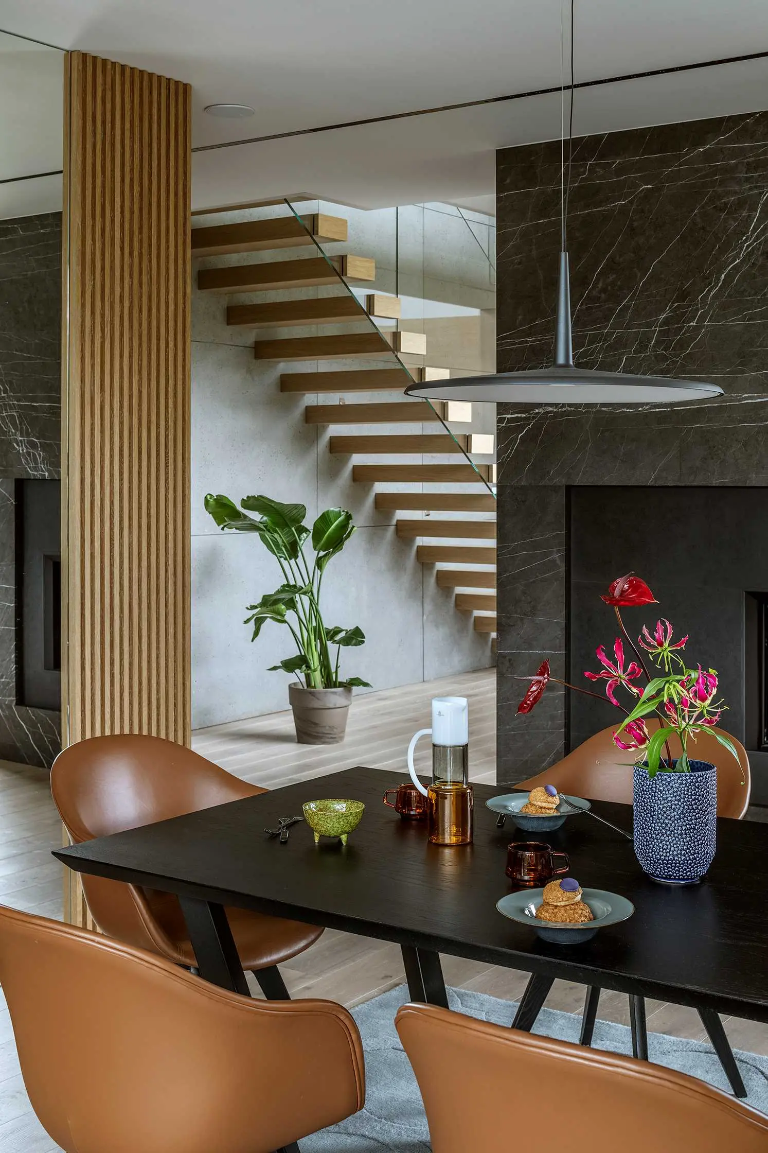 Projekt rodzinnego domu opracowany został na podstawie szczegółowych wytycznych Inwestora oraz architekta budynku. Niezwykle harmonijne wnętrze, które zostało wplecione w otaczającą go przyrodą. W projekcie wykorzystano wysokiej jakości materiały nawiązujące do naturalnych produktów. Przewodnie kolory to naturalne drewno, szarości przechodzące delikatnie w biel. Wszystko znakomicie ze sobą się komponuje tworząc idealny dom.