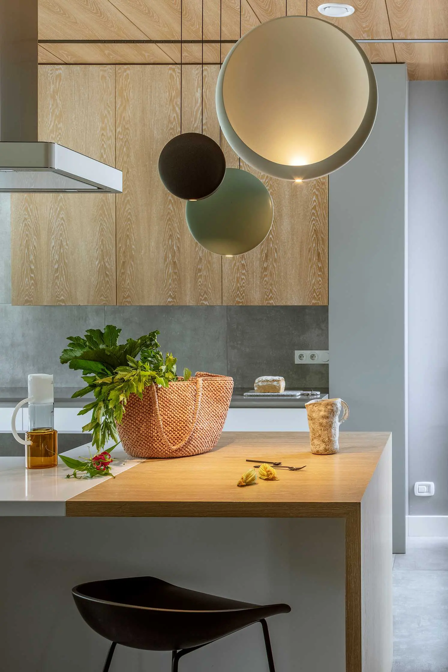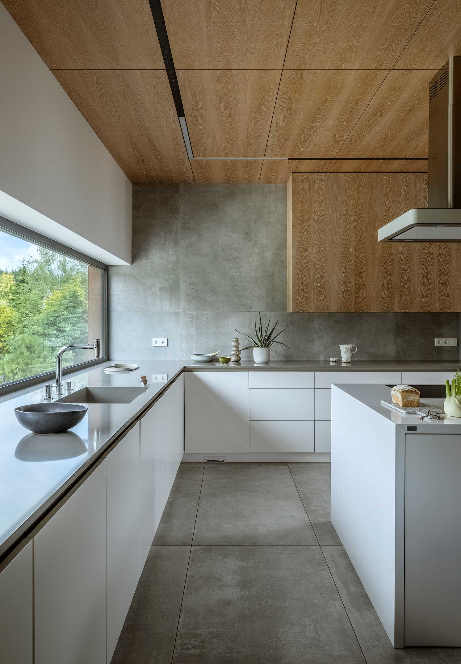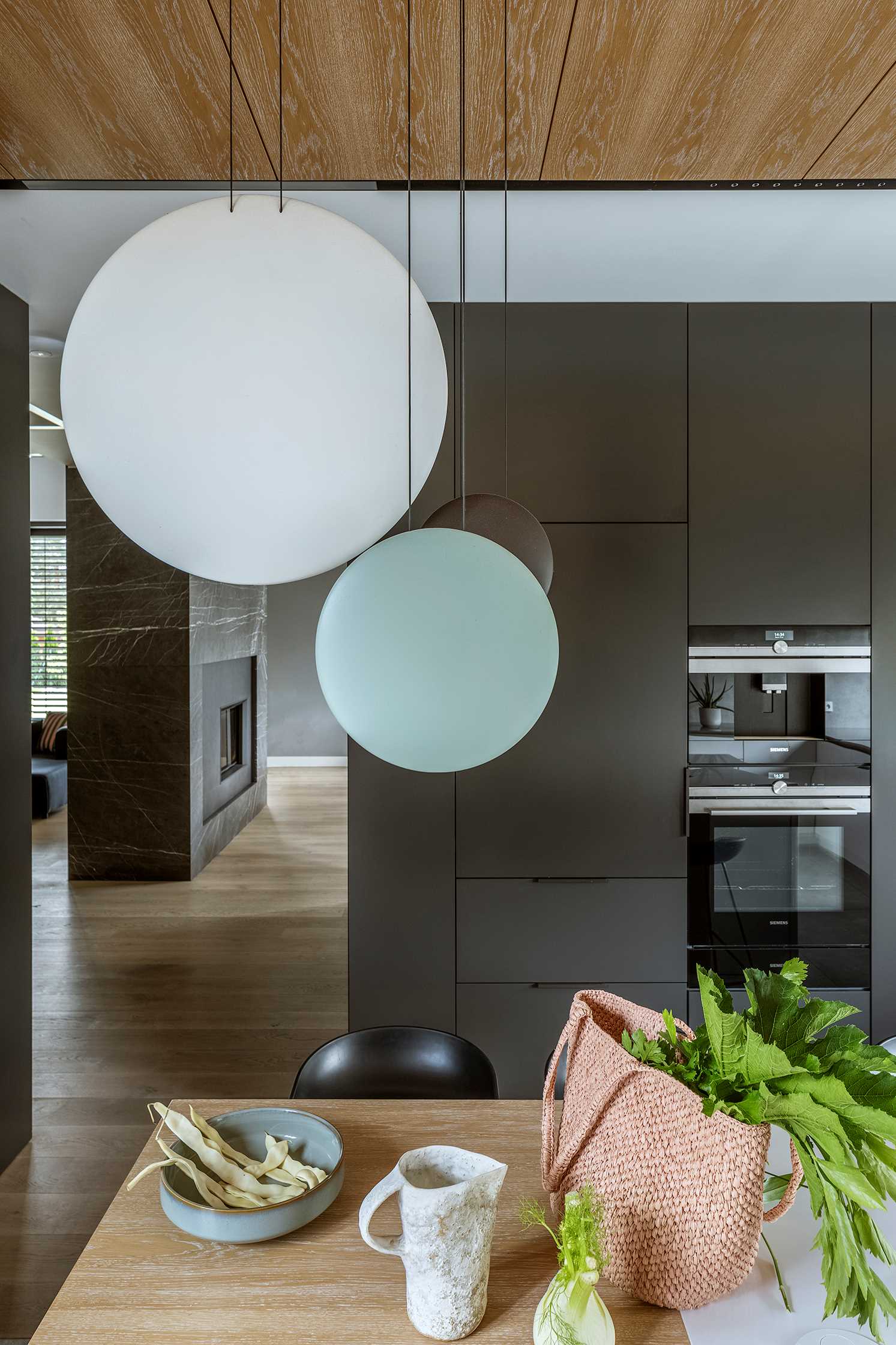 Sercem domu jest przestronna kuchnia, urządzona tak, aby z przyjemnością można było przygotowywać posiłki wspólnie z całą rodziną. Surowość płytek imitujących beton ociepla drewniana wyspa oraz ciekawe rozwiązanie, jakim jest drewniany sufit. W nim zainstalowano szynowe techniczne oświetlenie. Wyspę ozdabiają ikony designu lampy Vibia Cosmos. Mocnym kontrapunktem tej kuchni jest ciemna szafa z dużą ilością miejsca do przechowywania, z piekarnikiem i zabudowaną lodówką.